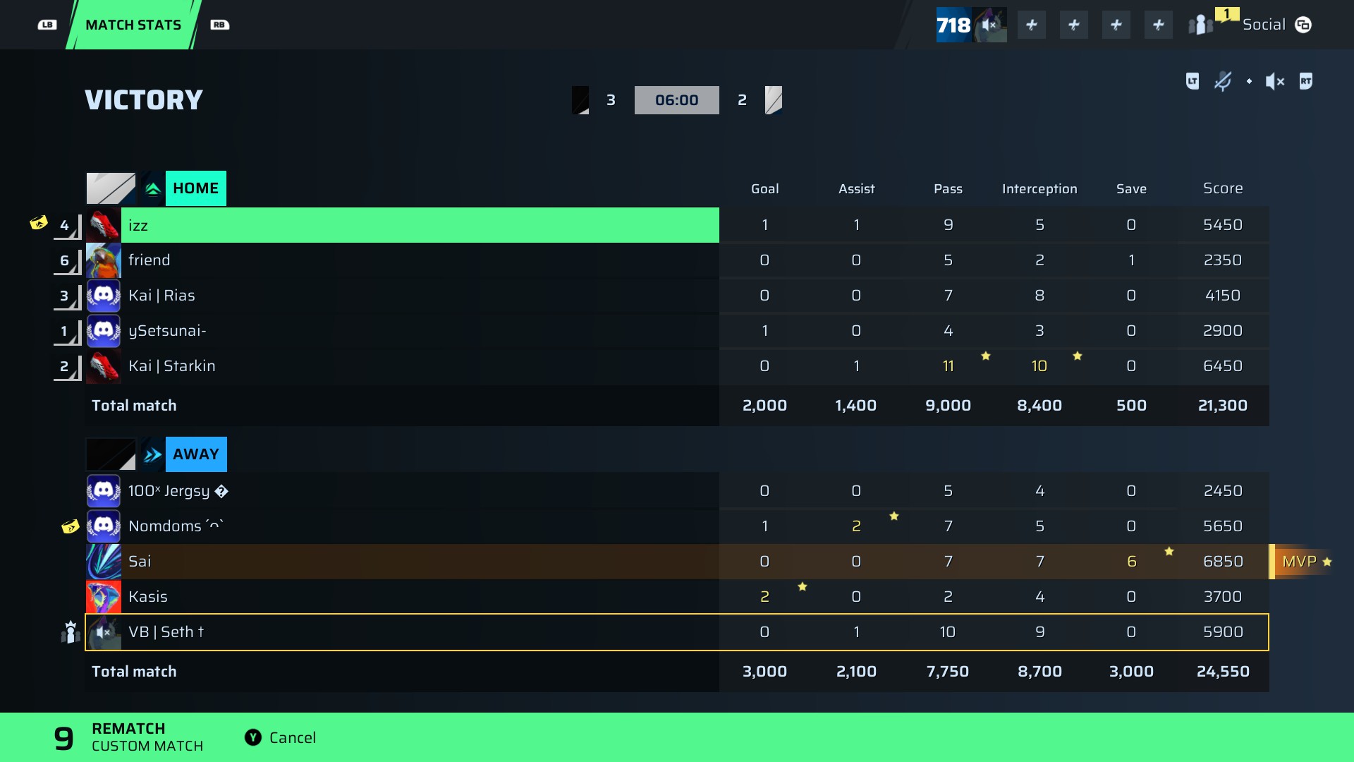 | Player | Goals | Assists | Passes | Interceptions | Saves | Score | Clean Sheet |