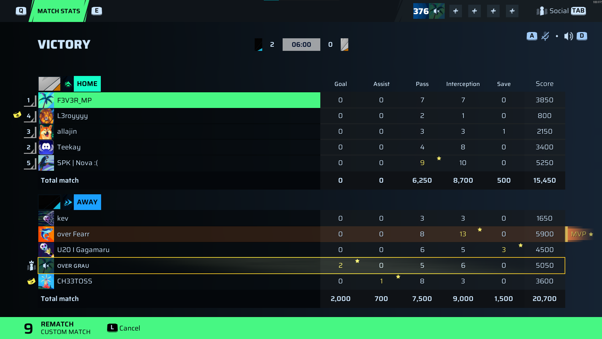 | Player | Goals | Assists | Passes | Interceptions | Saves | Score | Clean Sheet |