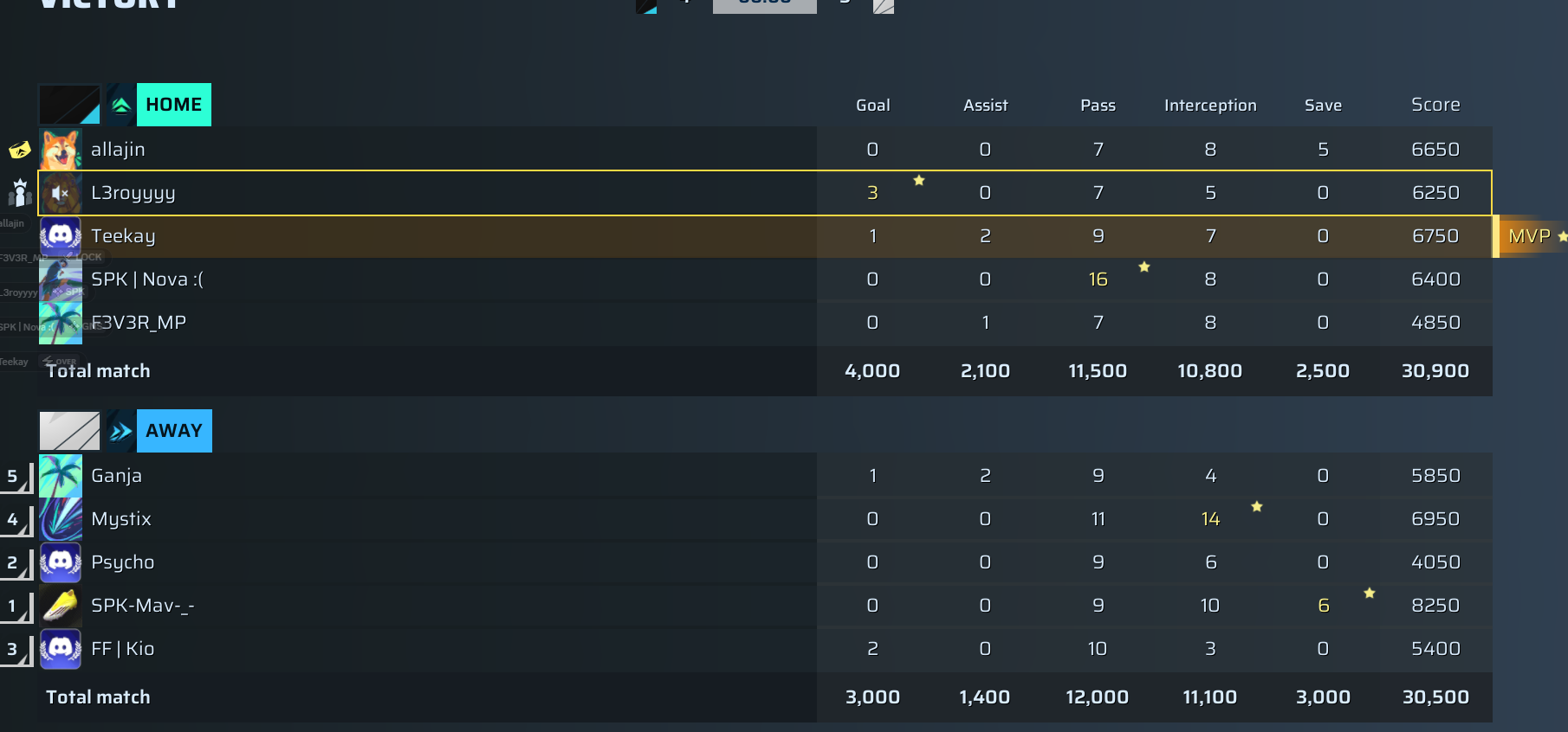 | Player | Goals | Assists | Passes | Interceptions | Saves | Score | Clean Sheet |