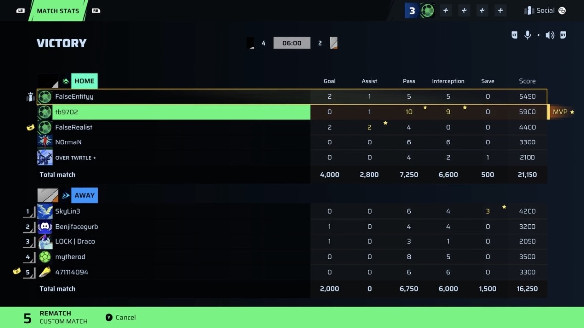 | Player | Goals | Assists | Passes | Interceptions | Saves | Score | Clean Sheet |