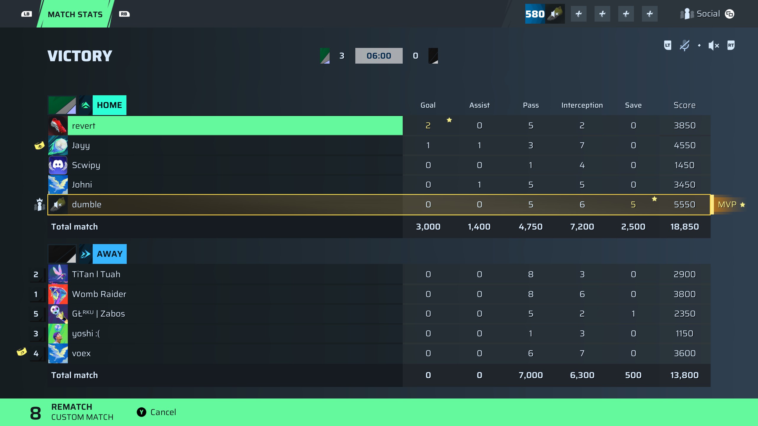 | Player | Goals | Assists | Passes | Interceptions | Saves | Score | Clean Sheet |