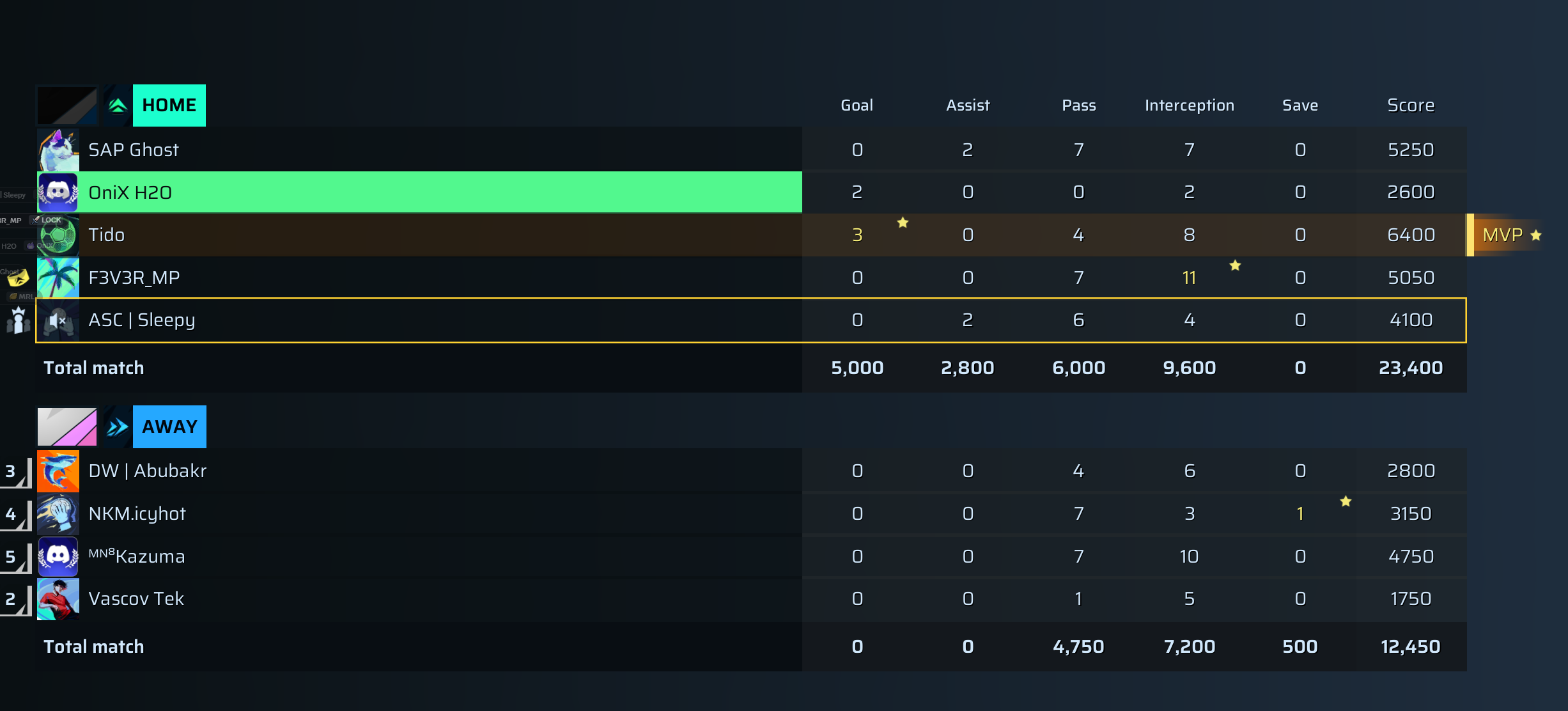 | Player | Goals | Assists | Passes | Interceptions | Saves | Score | Clean Sheet |