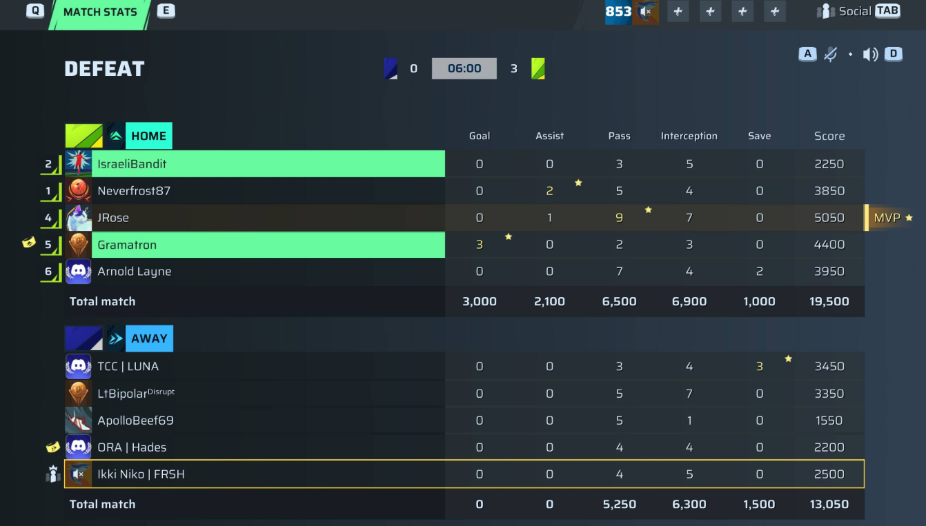 | Player | Goals | Assists | Passes | Interceptions | Saves | Score | Clean Sheet |