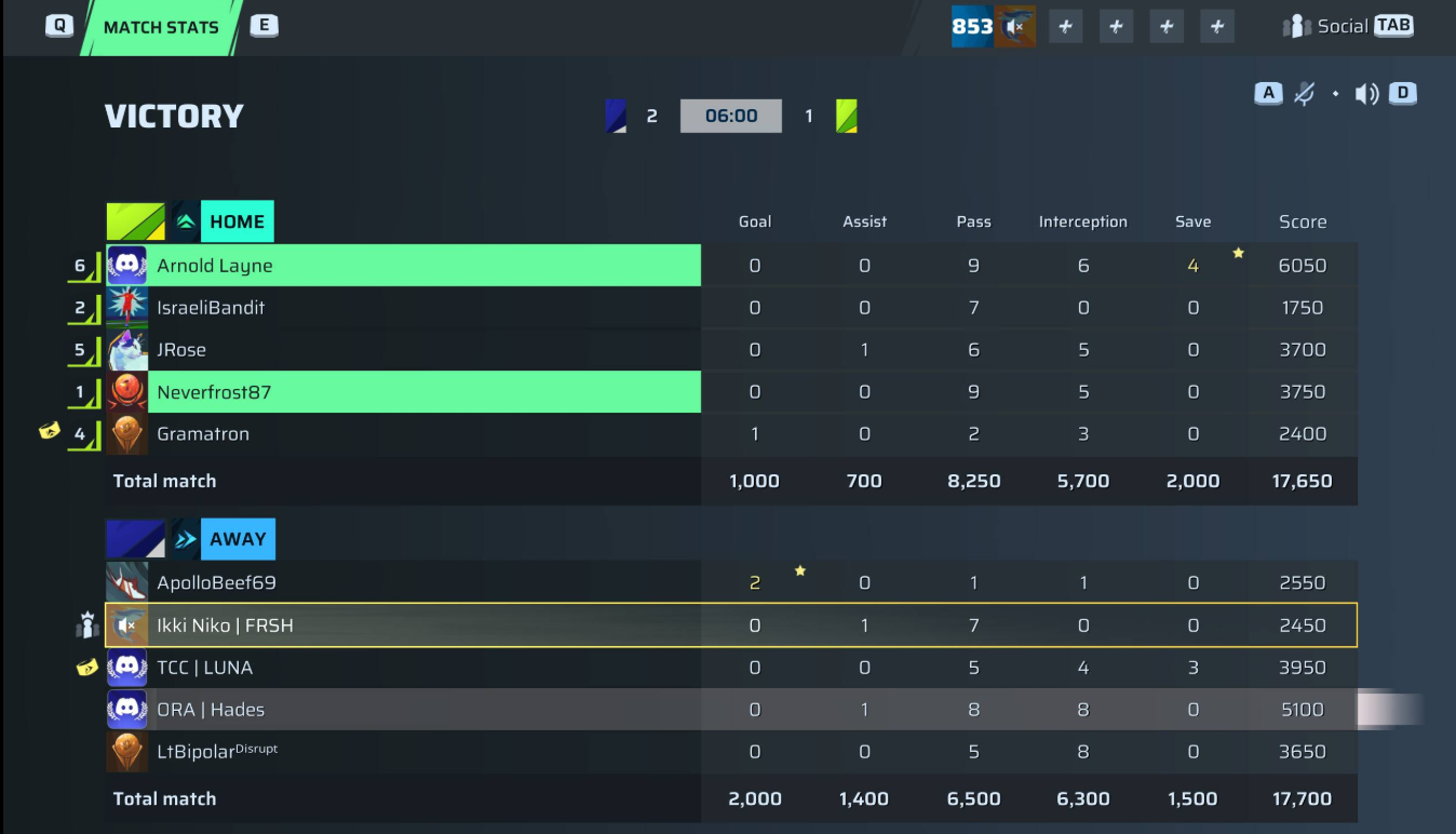 | Player | Goals | Assists | Passes | Interceptions | Saves | Score | Clean Sheet |