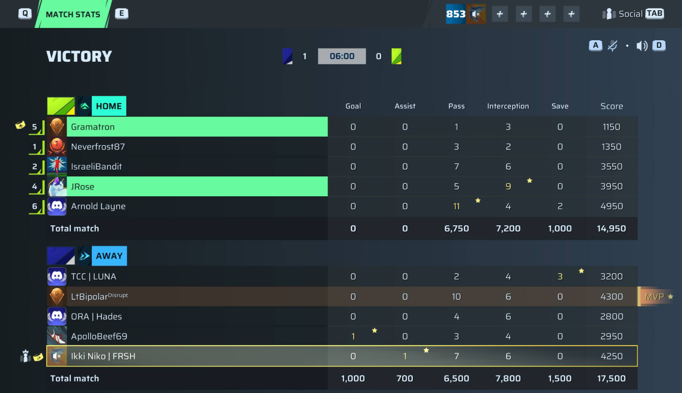 | Player | Goals | Assists | Passes | Interceptions | Saves | Score | Clean Sheet |