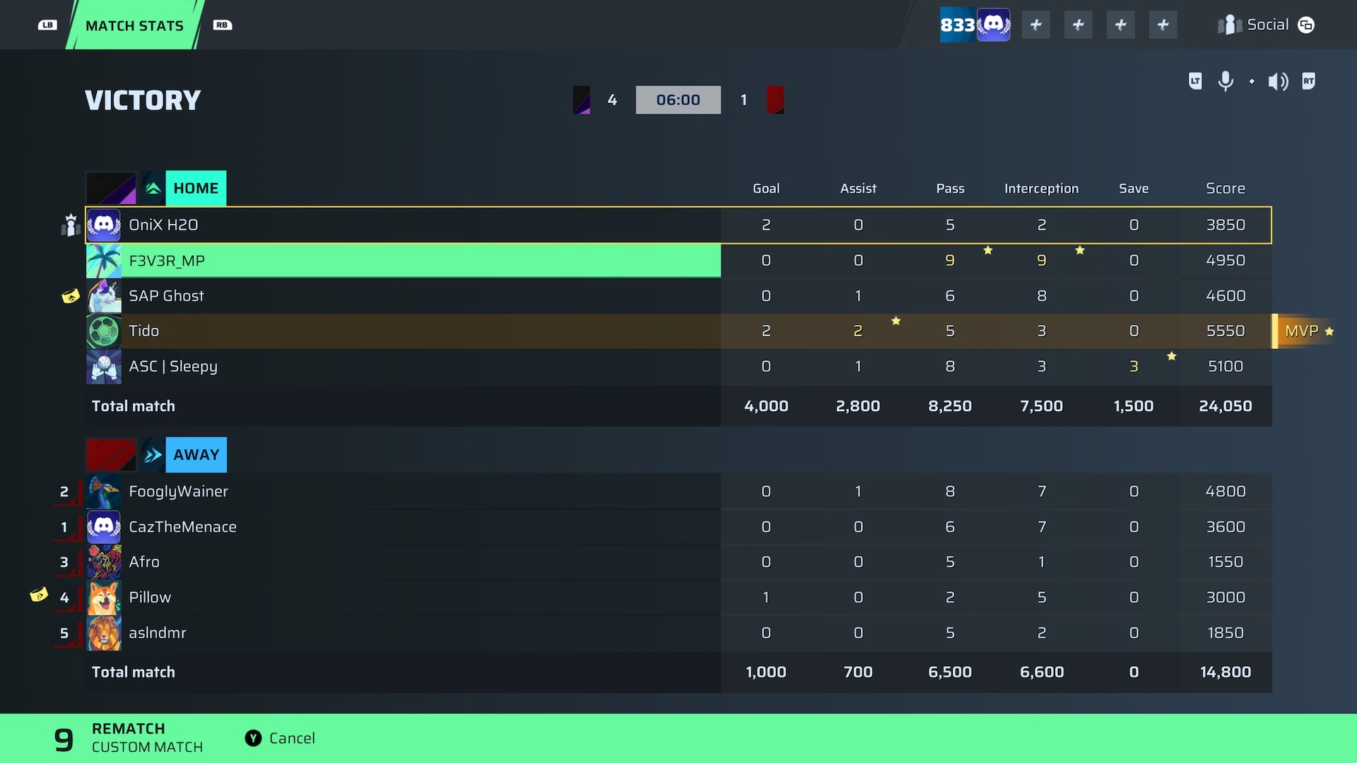 OniX H2O🐐#34 Striker83 OVR | 2 | 0 | 5 | 2 | 0 | 3,850 | — |