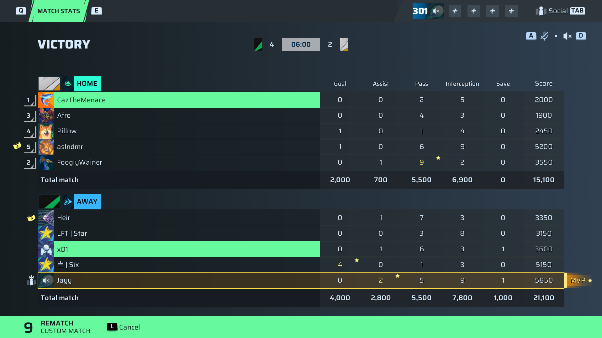 | Player | Goals | Assists | Passes | Interceptions | Saves | Score | Clean Sheet |