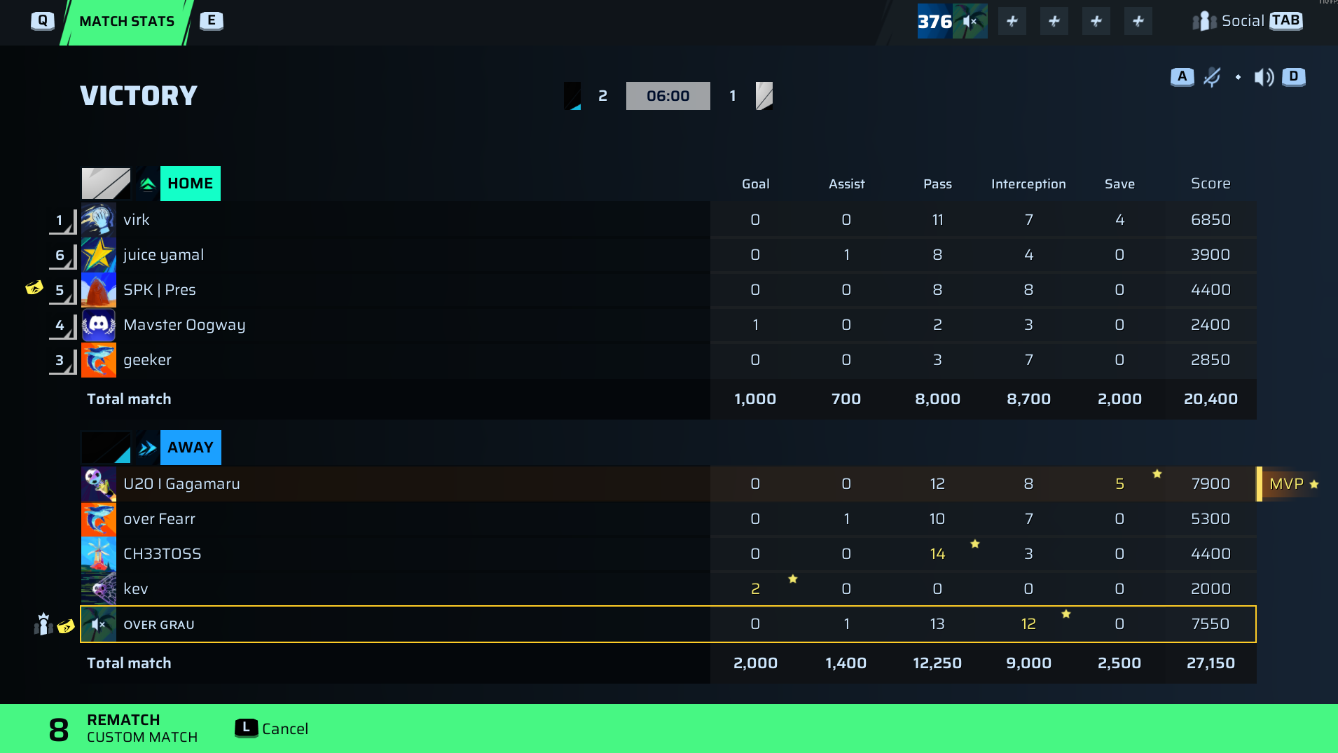 | Player | Goals | Assists | Passes | Interceptions | Saves | Score | Clean Sheet |