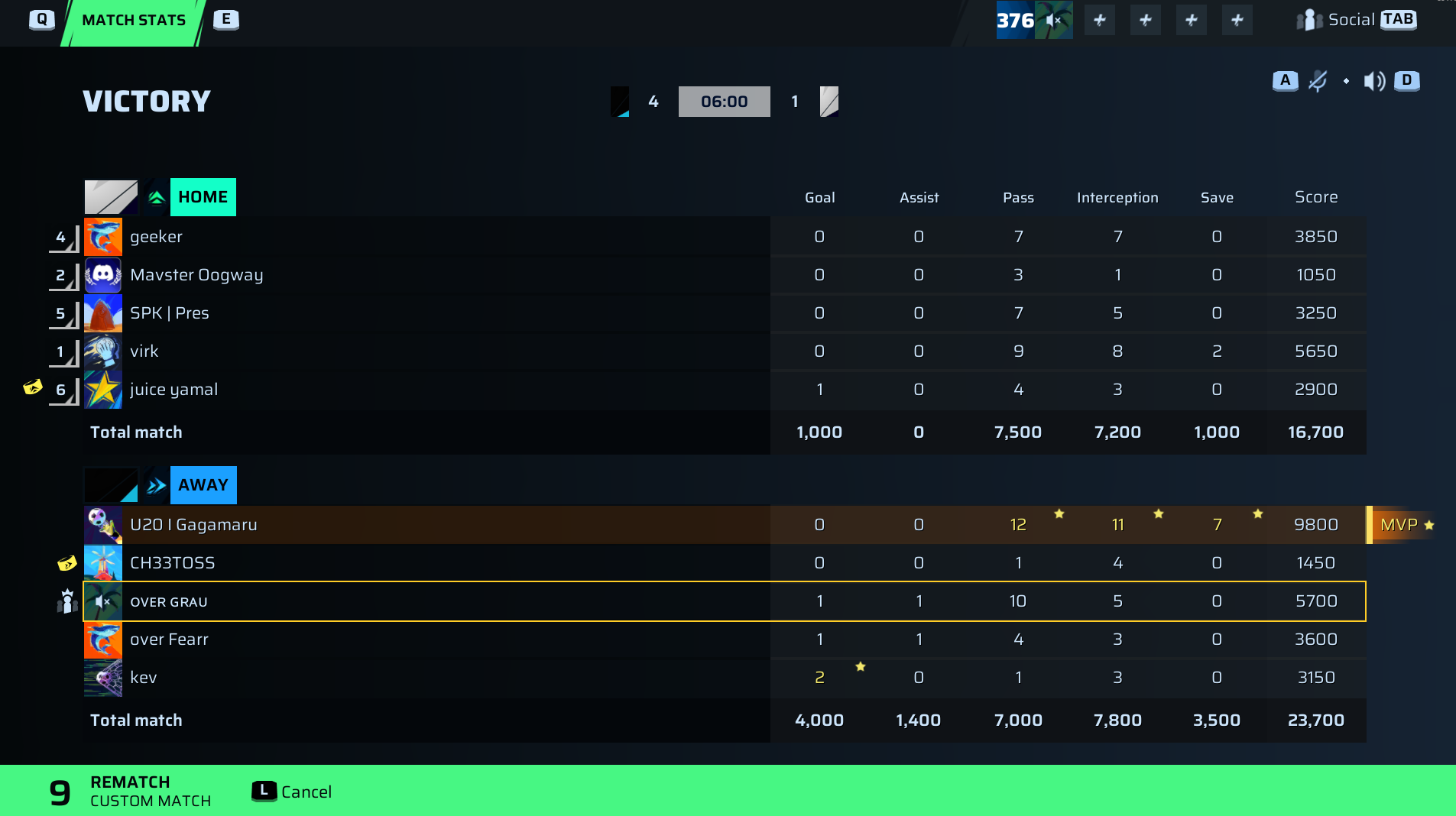 | Player | Goals | Assists | Passes | Interceptions | Saves | Score | Clean Sheet |