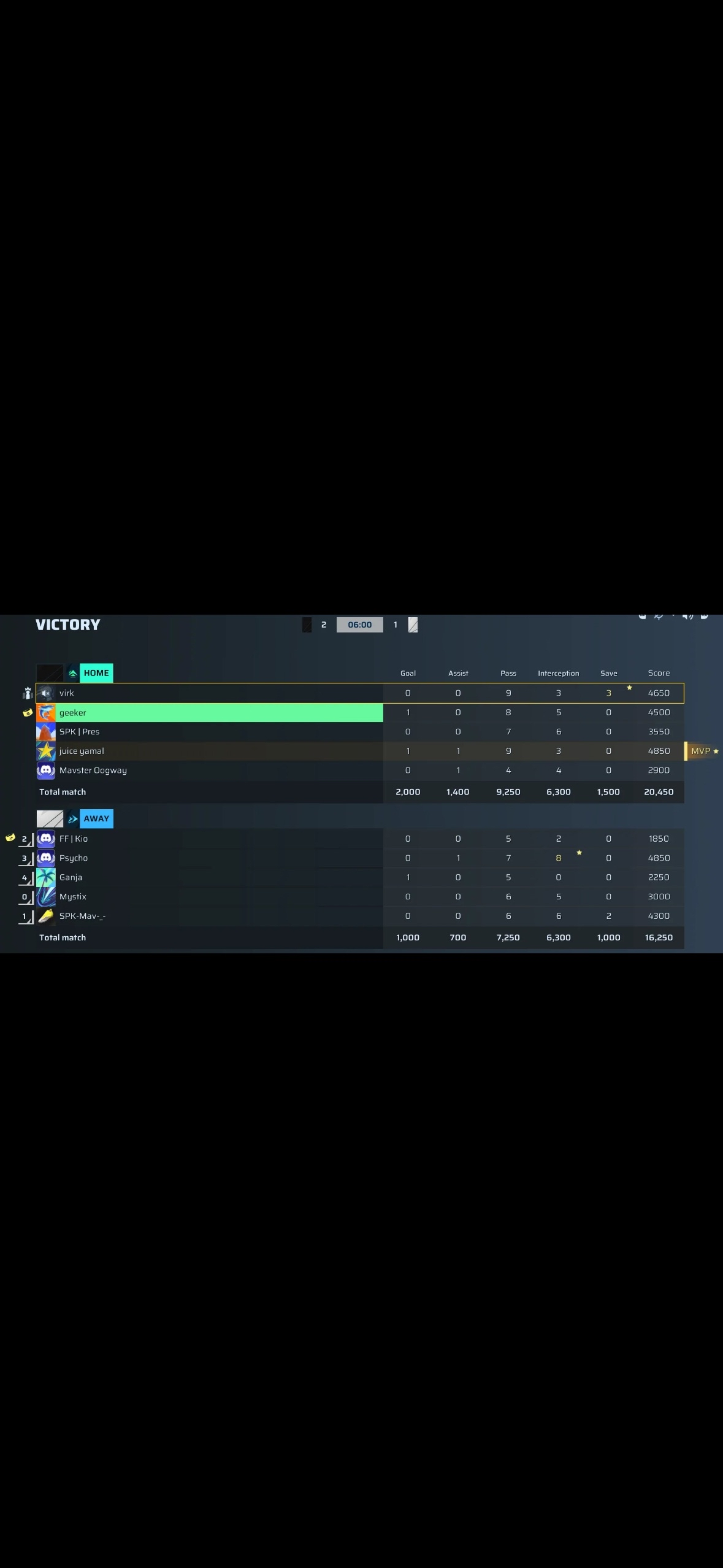 | Player | Goals | Assists | Passes | Interceptions | Saves | Score | Clean Sheet |