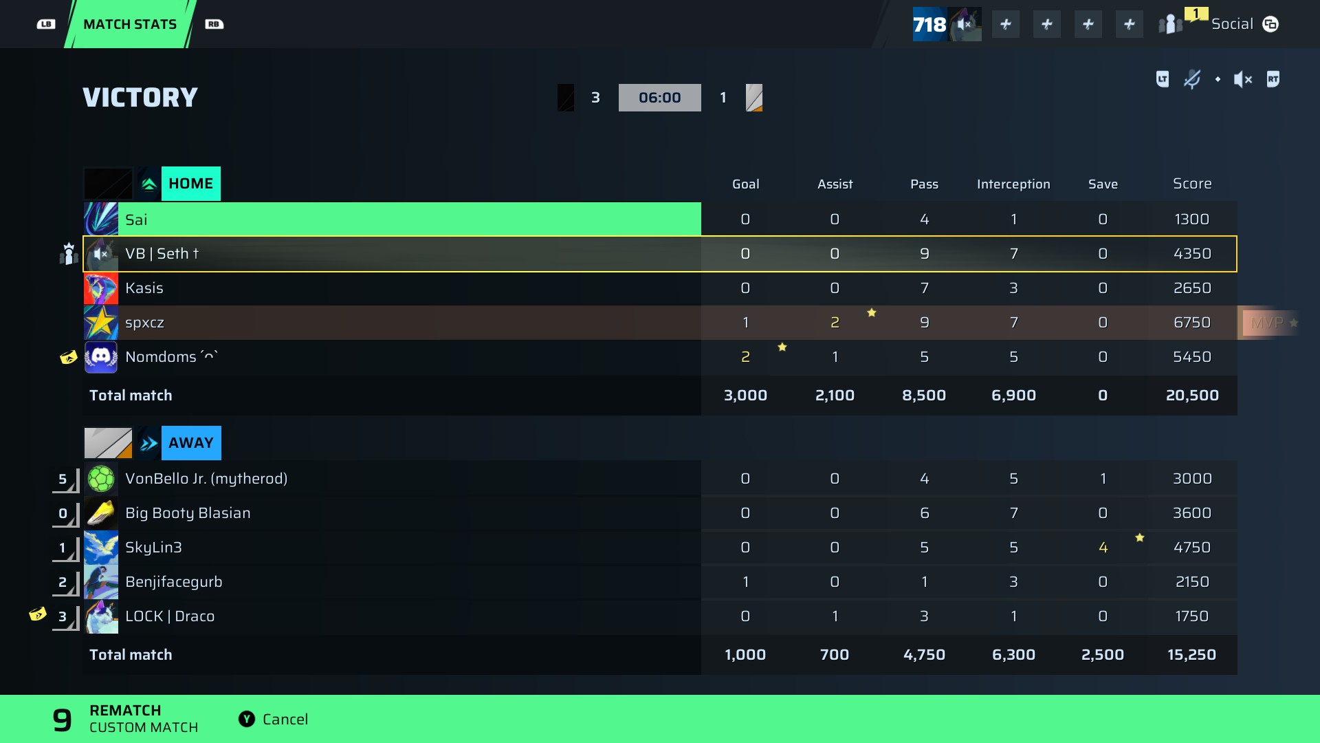 | Player | Goals | Assists | Passes | Interceptions | Saves | Score | Clean Sheet |