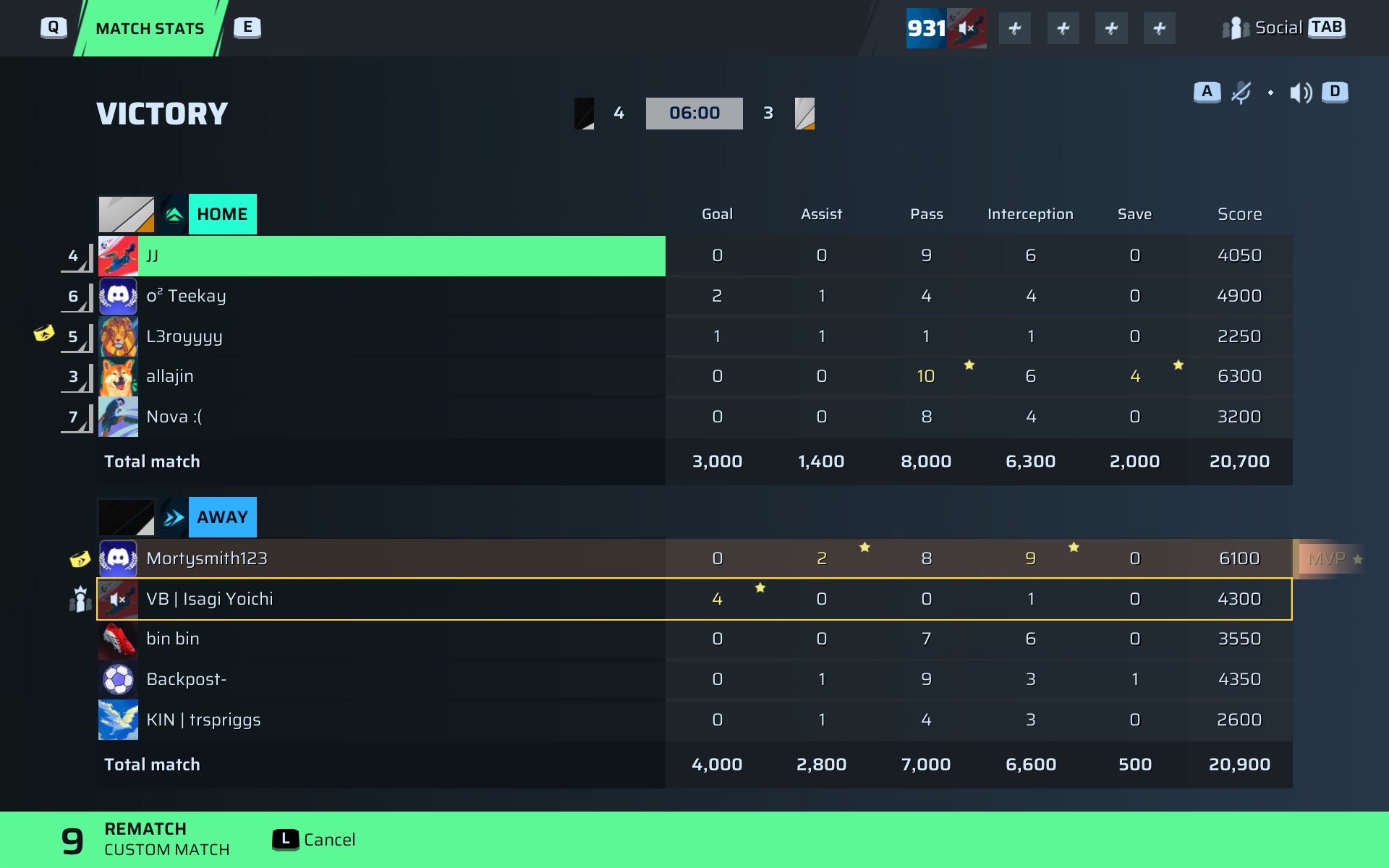 VB | Isagi Yoichi🐐#60 Striker91 OVR | 4 | 0 | 0 | 1 | 0 | 4,300 | — |