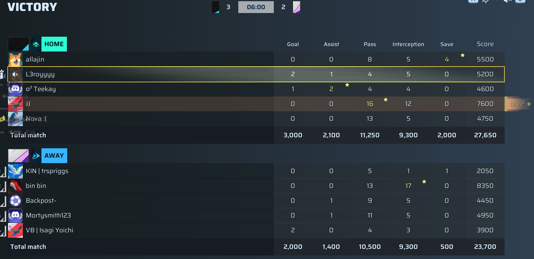 | Player | Goals | Assists | Passes | Interceptions | Saves | Score | Clean Sheet |
