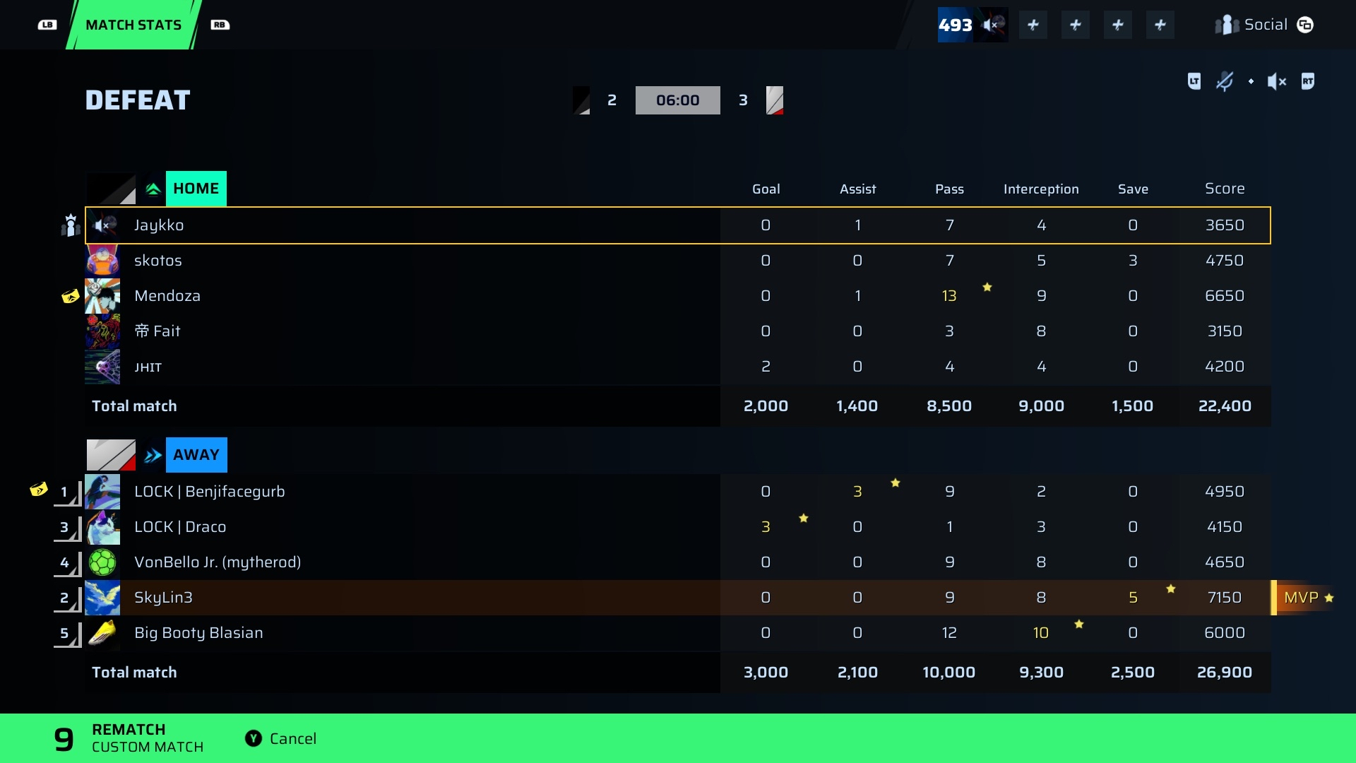 | Player | Goals | Assists | Passes | Interceptions | Saves | Score | Clean Sheet |