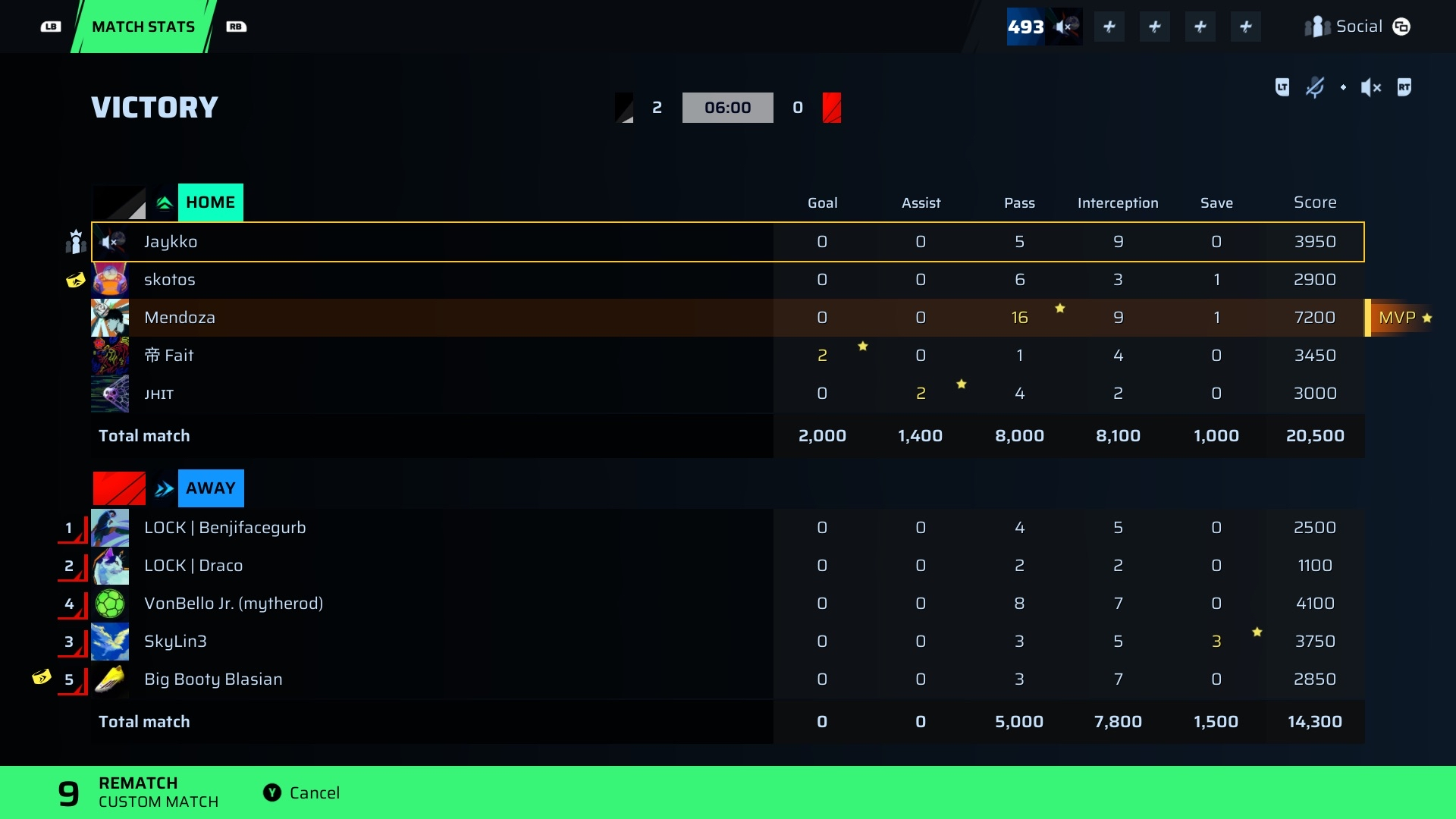 | Player | Goals | Assists | Passes | Interceptions | Saves | Score | Clean Sheet |