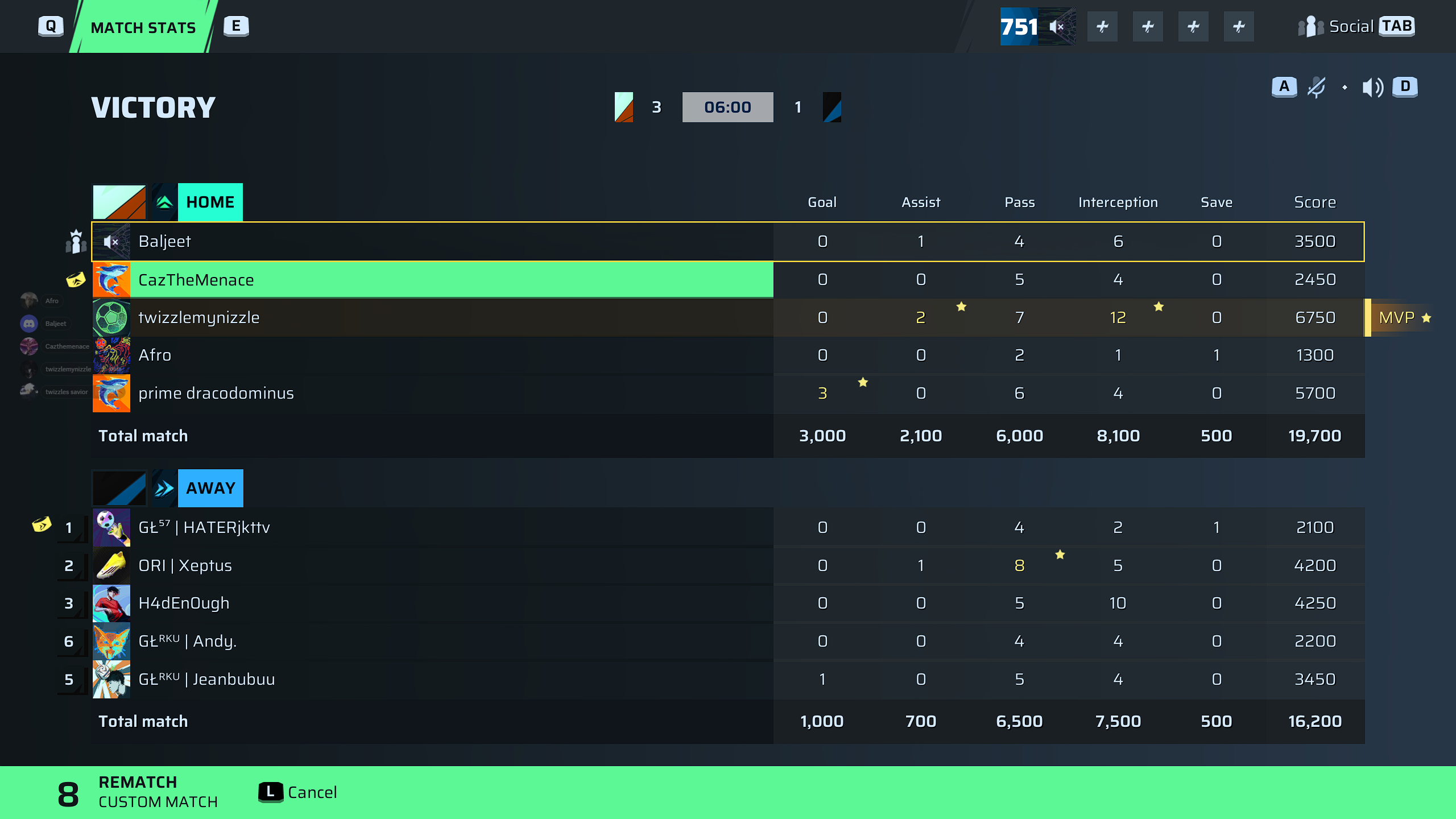 | Player | Goals | Assists | Passes | Interceptions | Saves | Score | Clean Sheet |