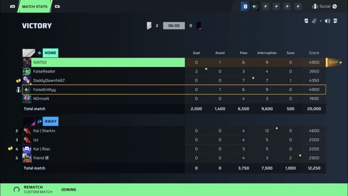 | Player | Goals | Assists | Passes | Interceptions | Saves | Score | Clean Sheet |