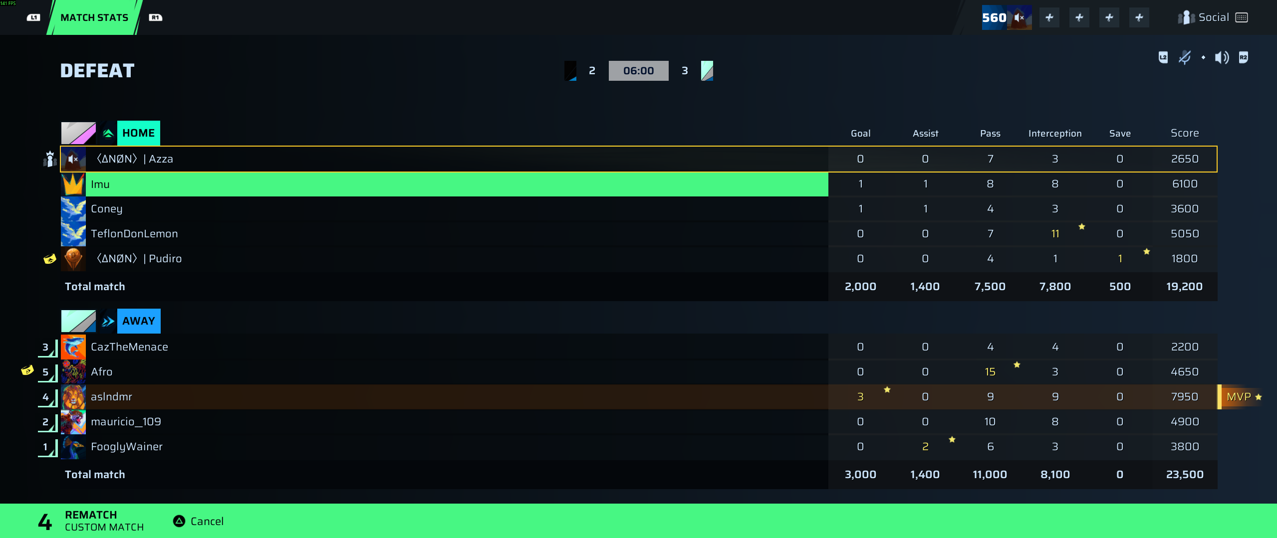 I suppose, reluctantly, we have to acknowledge aslndmr from PXG Development as the game's MVP after a jaw-dropping 3-goal performance playing defense. Yes, defense—scoring a hat trick while still juggling 9 passes and 9 interceptions, culminating in a 7,950 score, that's not just impressive, that's borderline supernatural in the MRL Development context. This is the kind of performance that demands respect even from the most stubborn skeptics. Put simply, aslndmr turned the pitch into his personal highlight reel tonight.