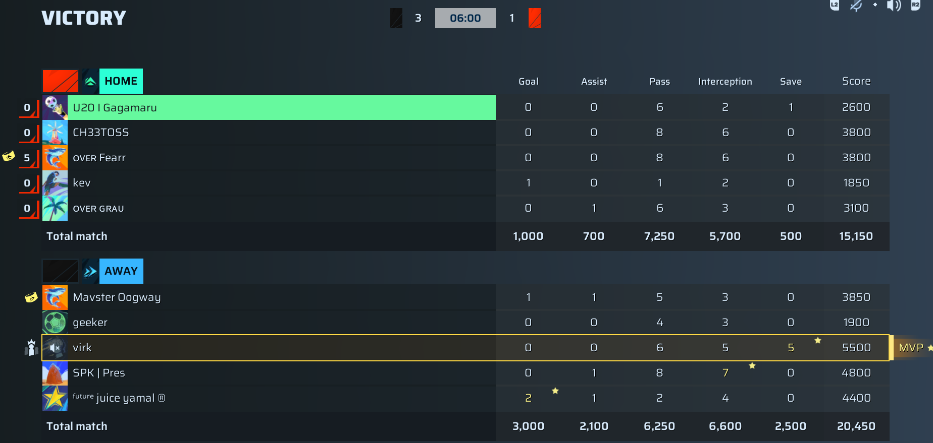 I suppose, reluctantly, Spliff must acknowledge Cold’s goalkeeper virk as the indisputable MVP of this final. With an insane score of 5500, including five critical saves and flawless positional play, virk stood like an unbreakable fortress in net. Not to be overshadowed, juice yamal, the GOAT #5, chipped in with two goals and an assist, his 4400 score punctuating his legacy as one of MRL’s elite. But let’s be clear: without virk’s superhuman presence, Cold would not have steamrolled For the Fans so decisively. This is the finest goalkeeping performance in an MRL Pro final you will find, hands down.