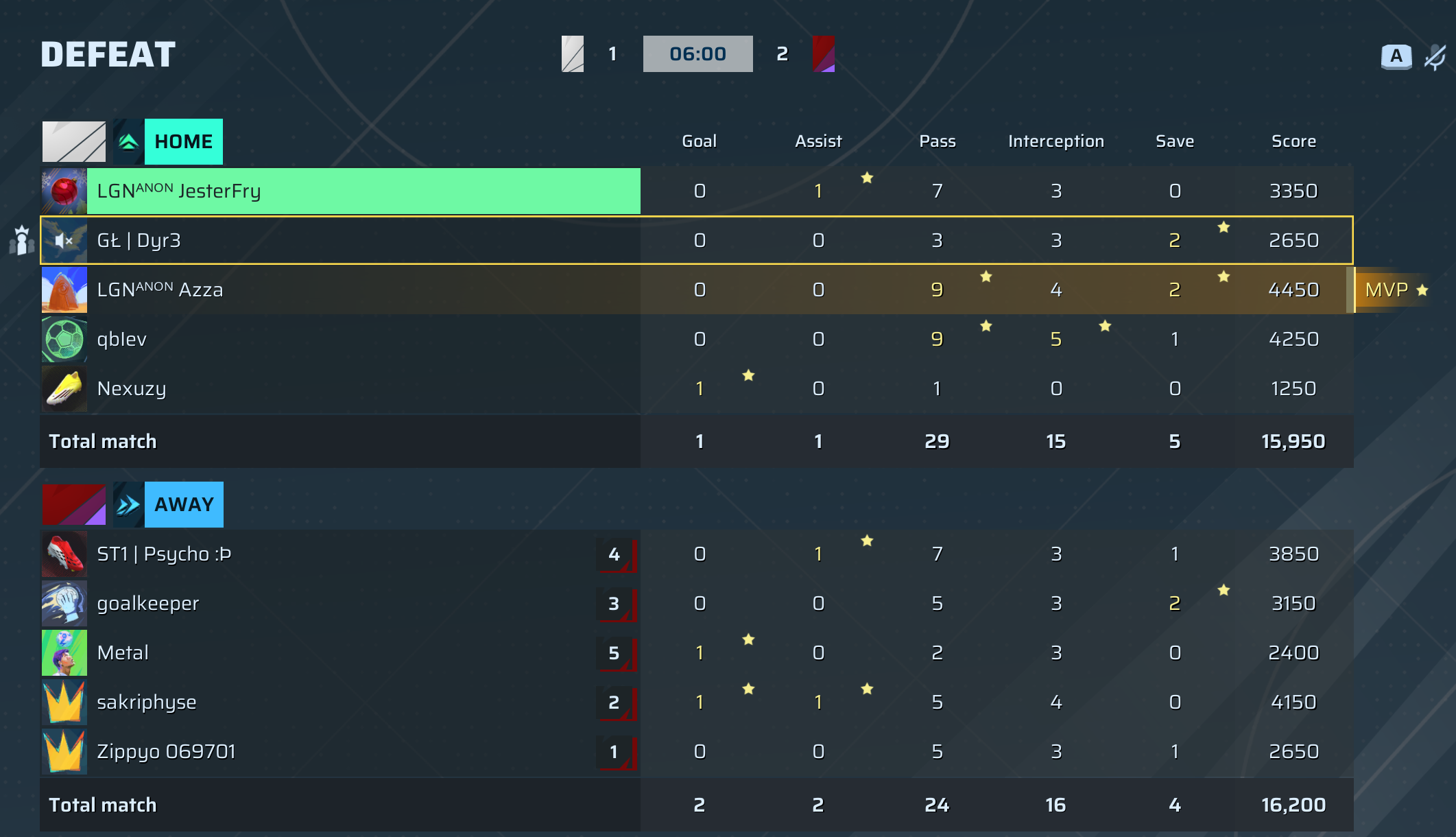 | Player | Goals | Assists | Passes | Interceptions | Saves | Score | Clean Sheet |