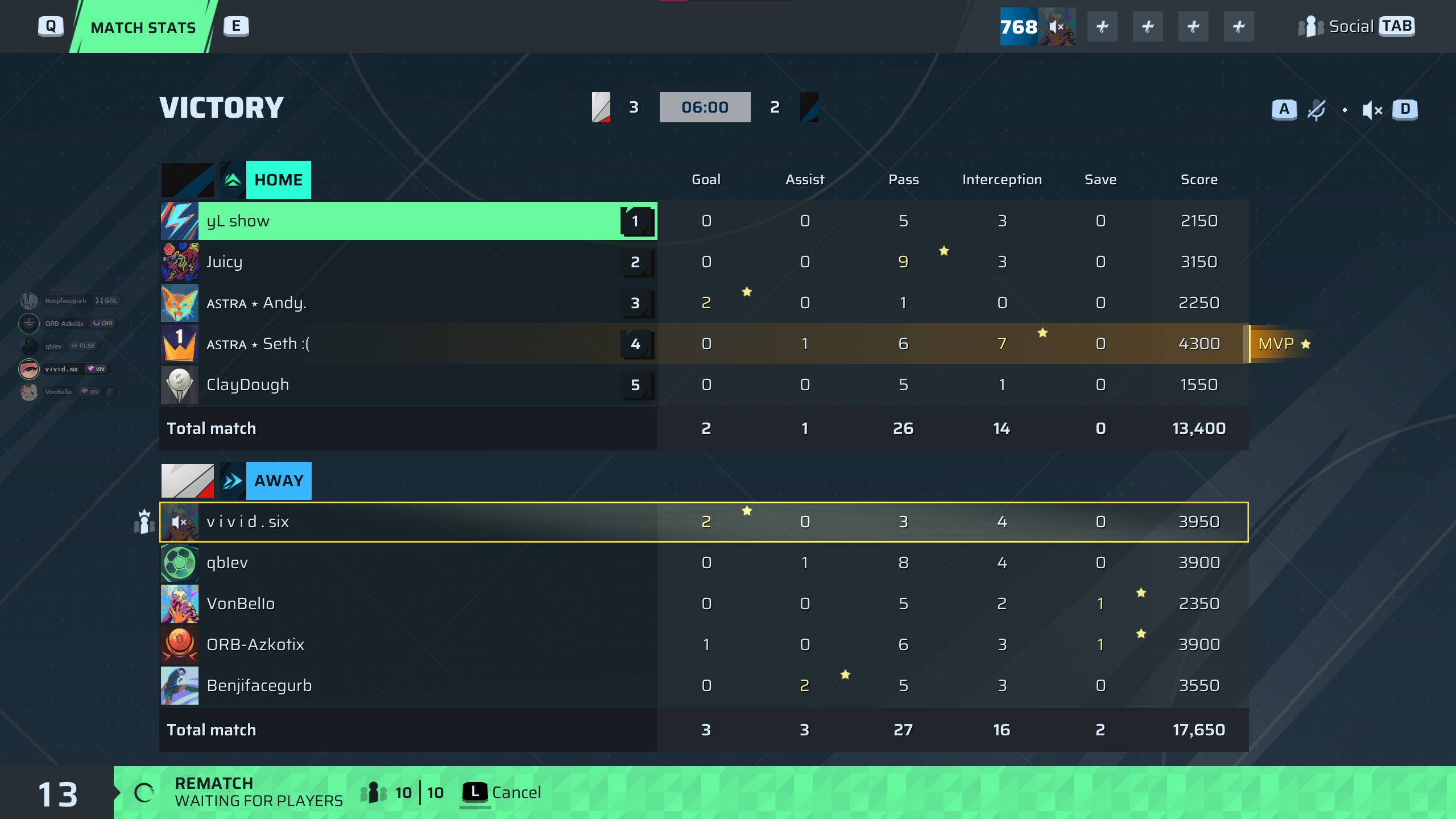 v i v i d . six🐐#194 Striker⭐ MVP | 2 | 0 | 3 | 4 | 0 | 3,950 | — |