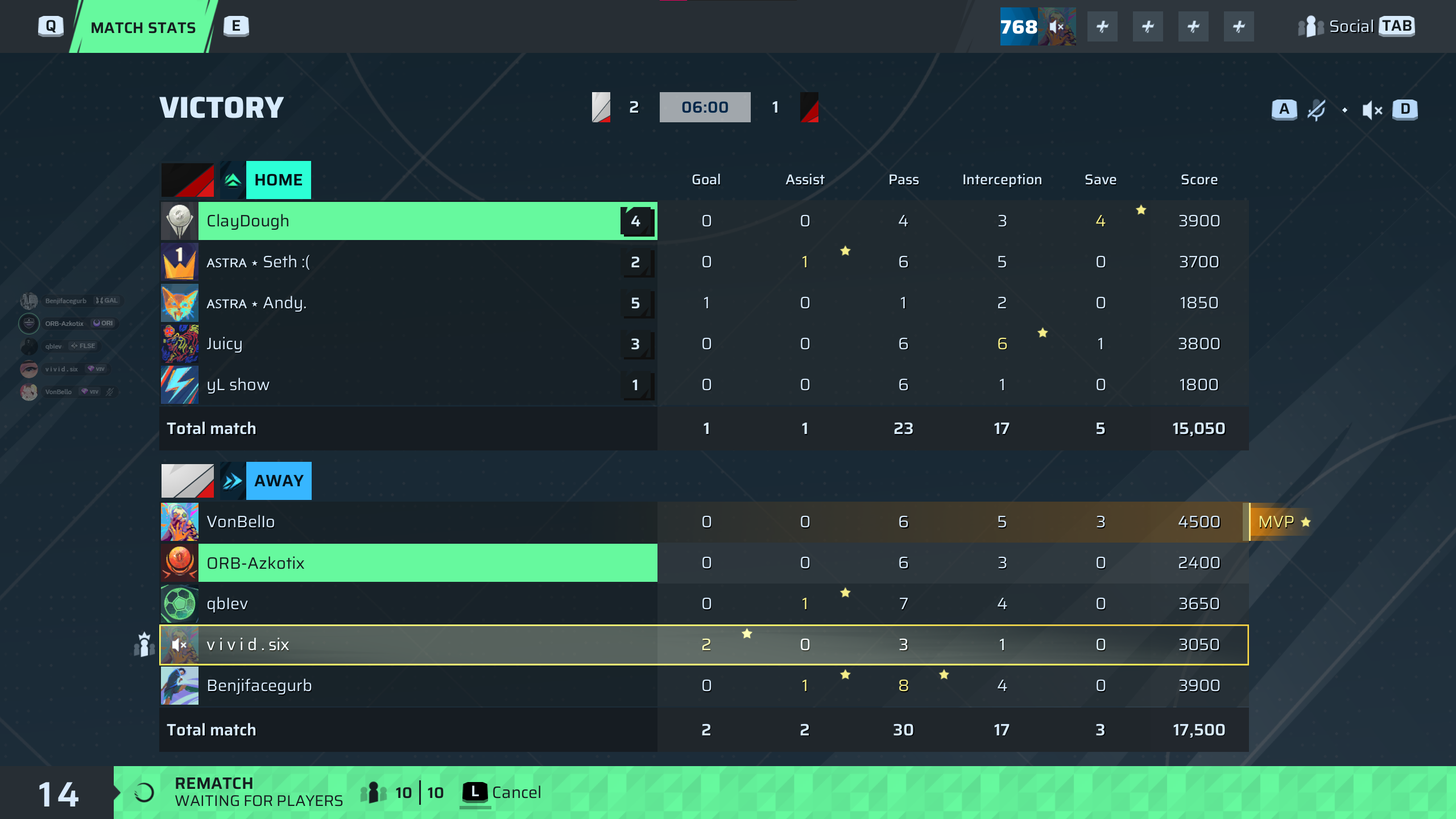 | Player | Goals | Assists | Passes | Interceptions | Saves | Score | Clean Sheet |