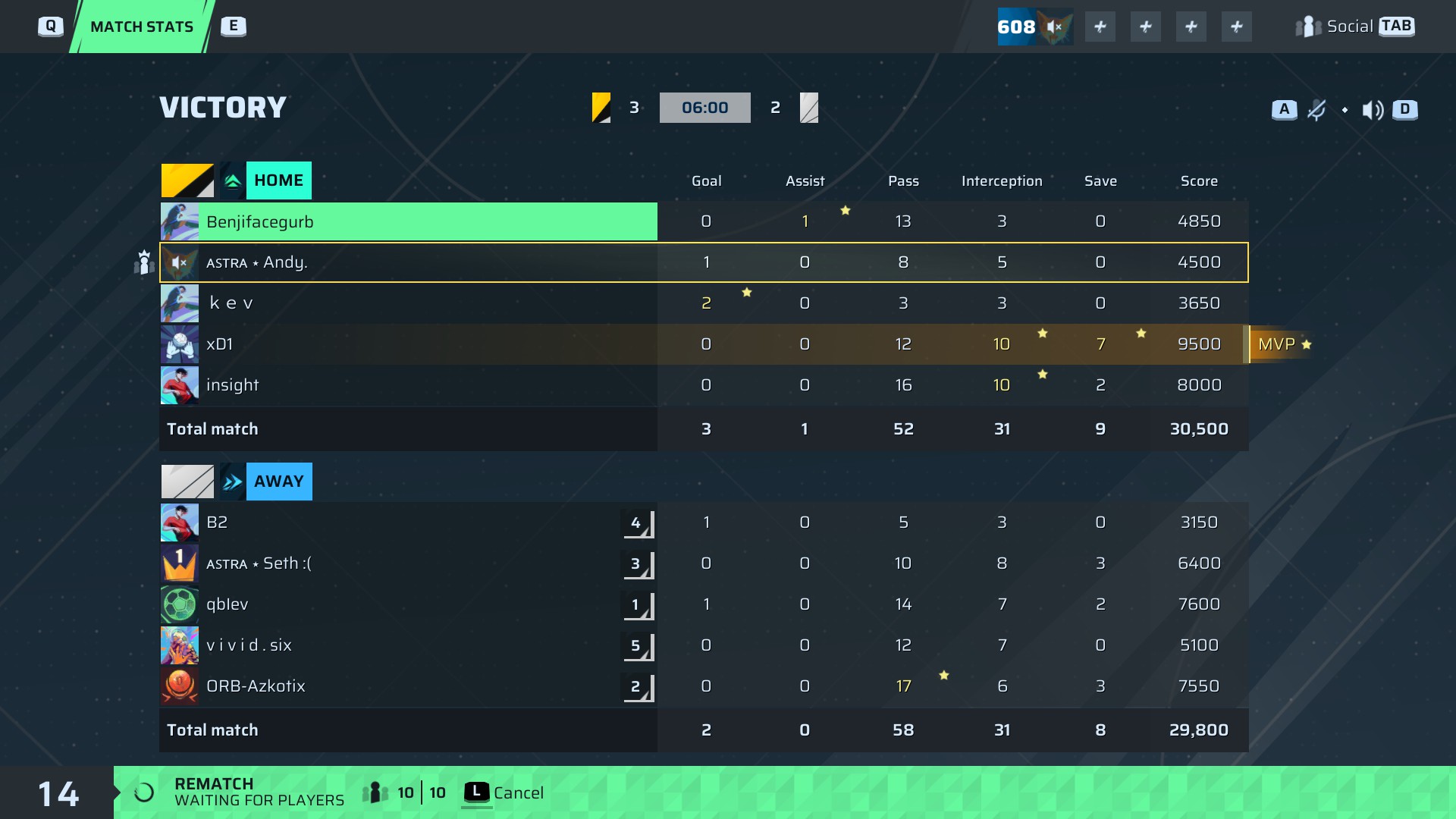 | Player | Goals | Assists | Passes | Interceptions | Saves | Score | Clean Sheet |