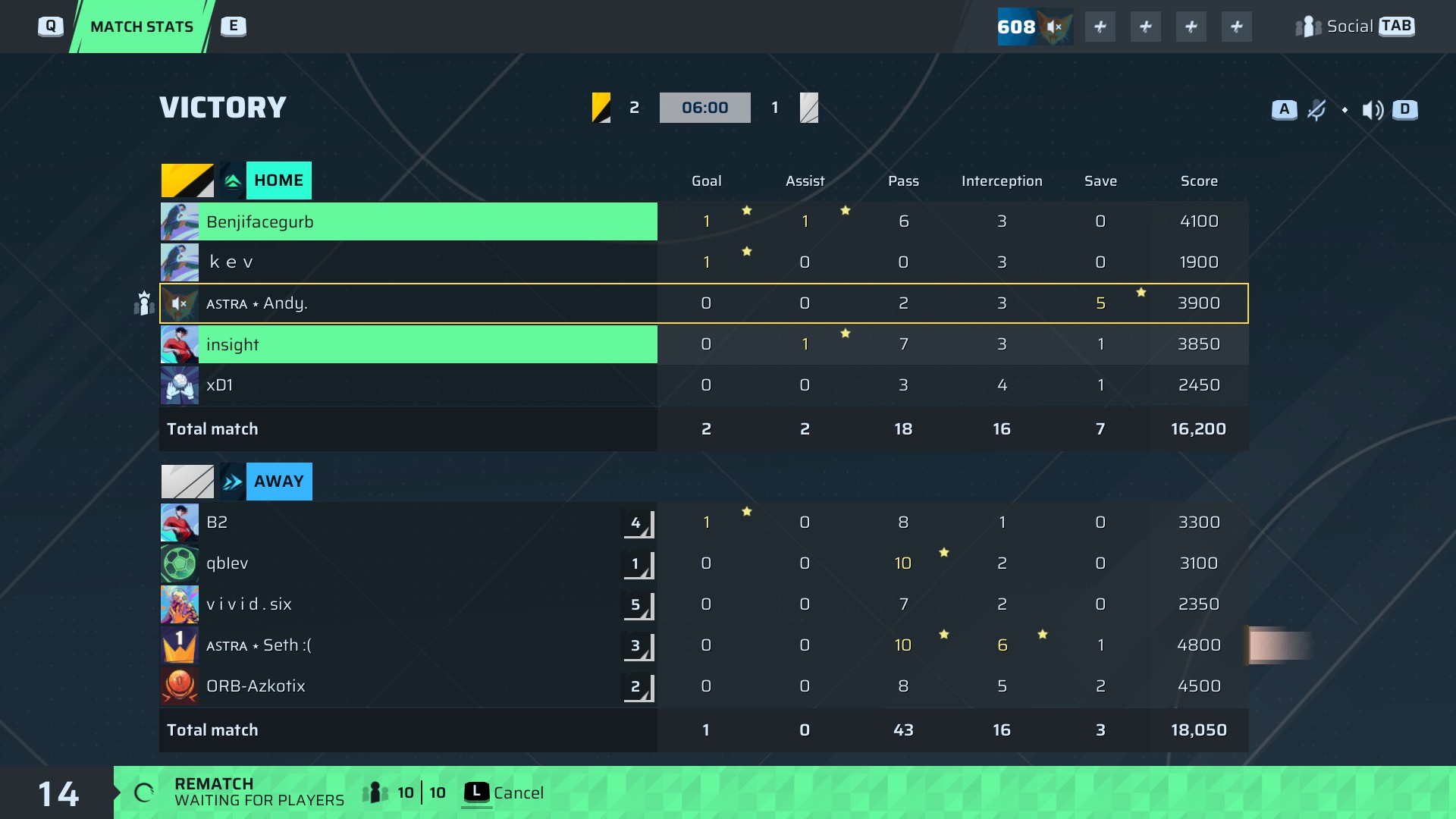 | Player | Goals | Assists | Passes | Interceptions | Saves | Score | Clean Sheet |