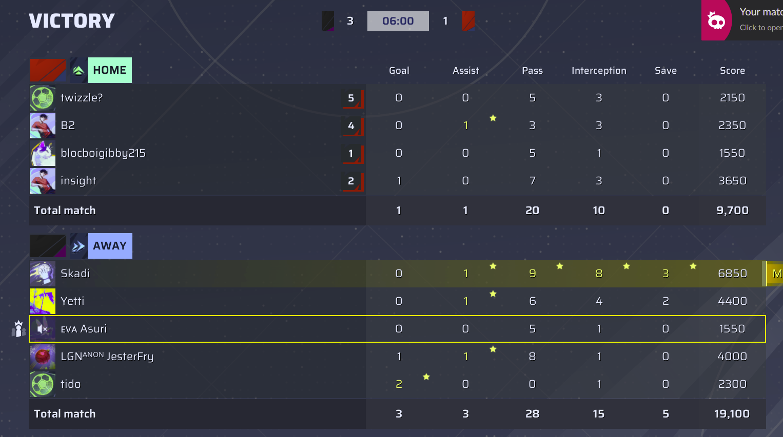 | Player | Goals | Assists | Passes | Interceptions | Saves | Score | Clean Sheet |