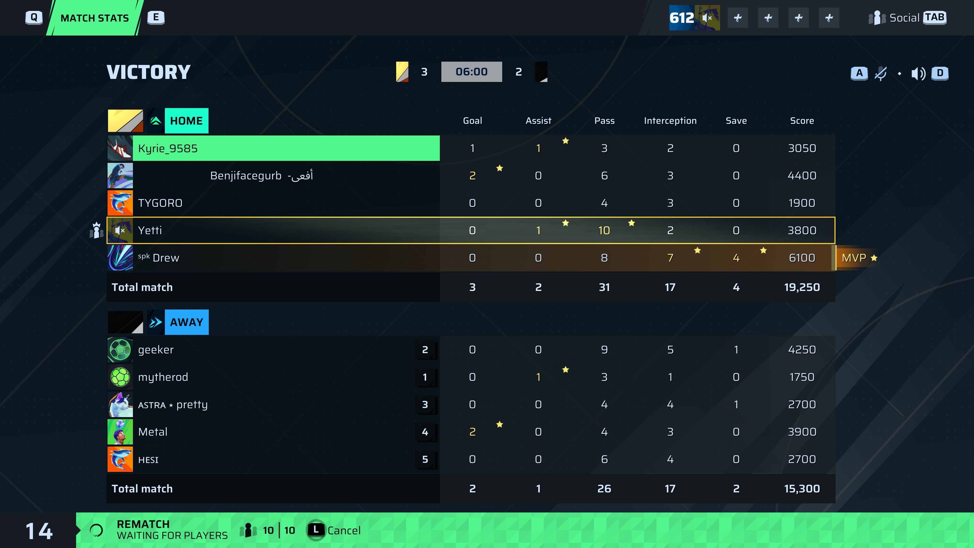 | Player | Goals | Assists | Passes | Interceptions | Saves | Score | Clean Sheet |
