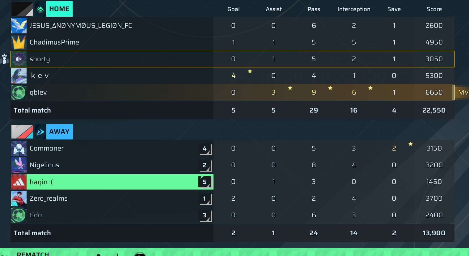 | Player | Goals | Assists | Passes | Interceptions | Saves | Score | Clean Sheet |