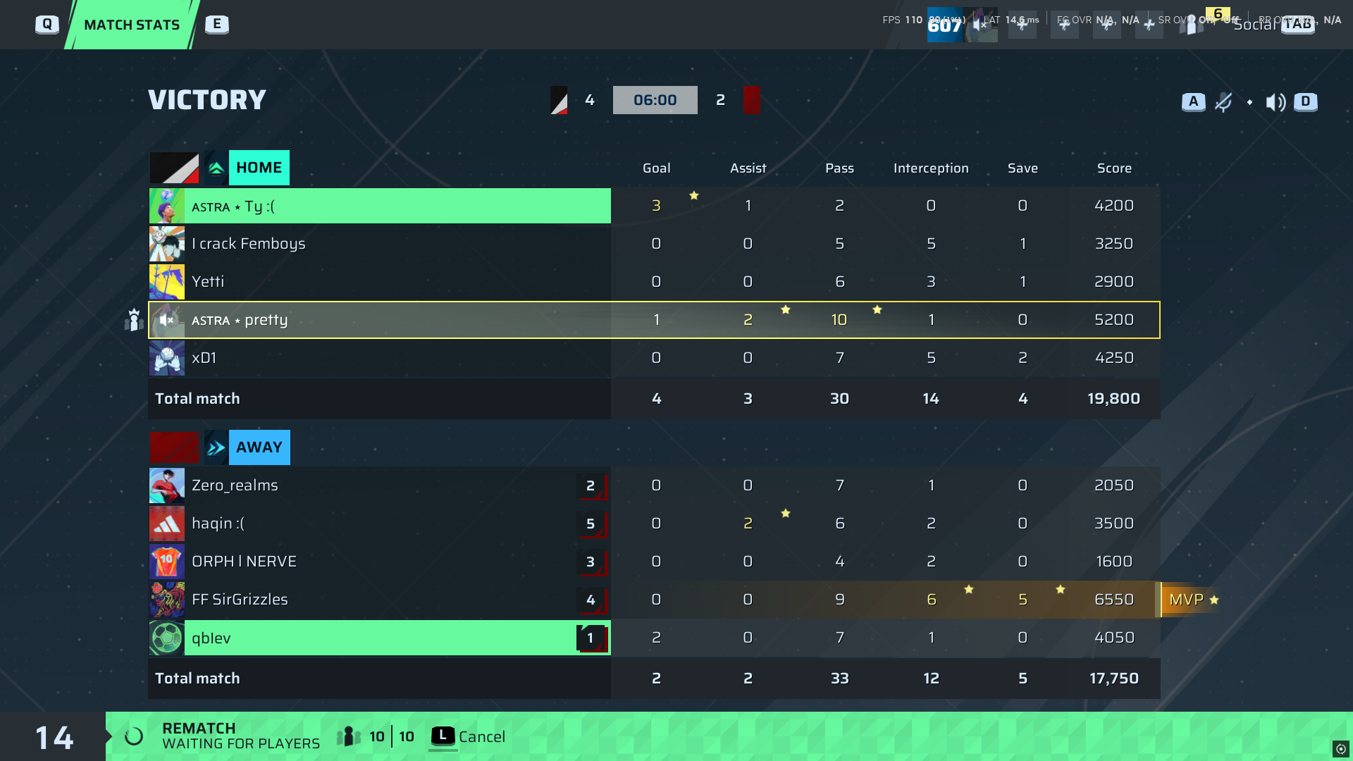 SirGrizzles🐐#21 Goalkeeper | 0 | 0 | 9 | 6 | 5 | 6,550 | ✗ No |