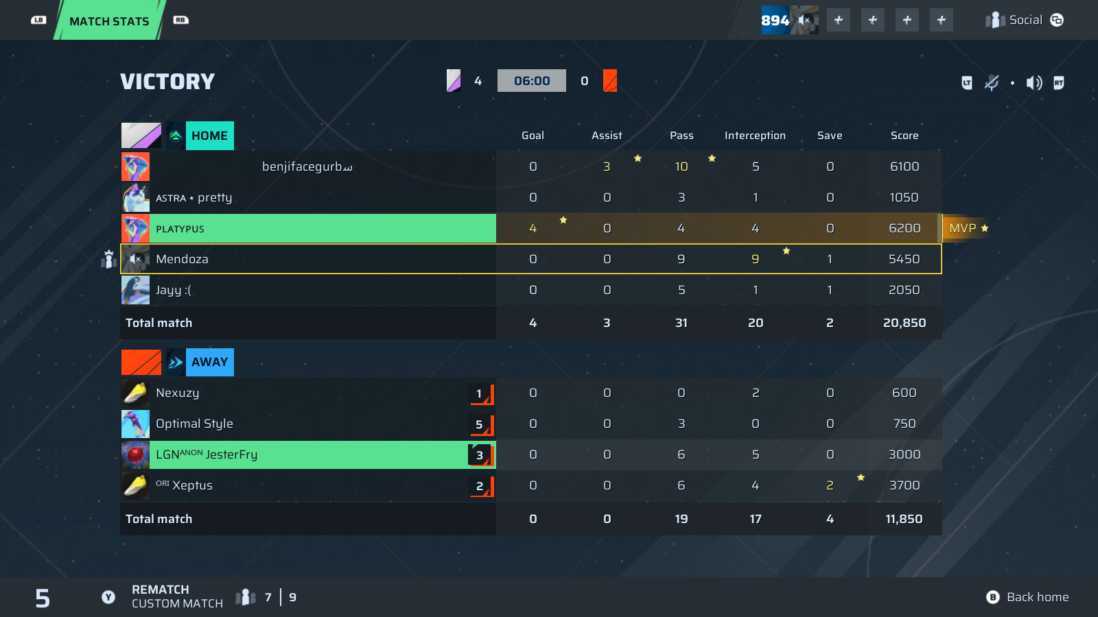 Platypus🐐#246 Striker⭐ MVP | 4 | 0 | 4 | 4 | 0 | 6,200 | — |