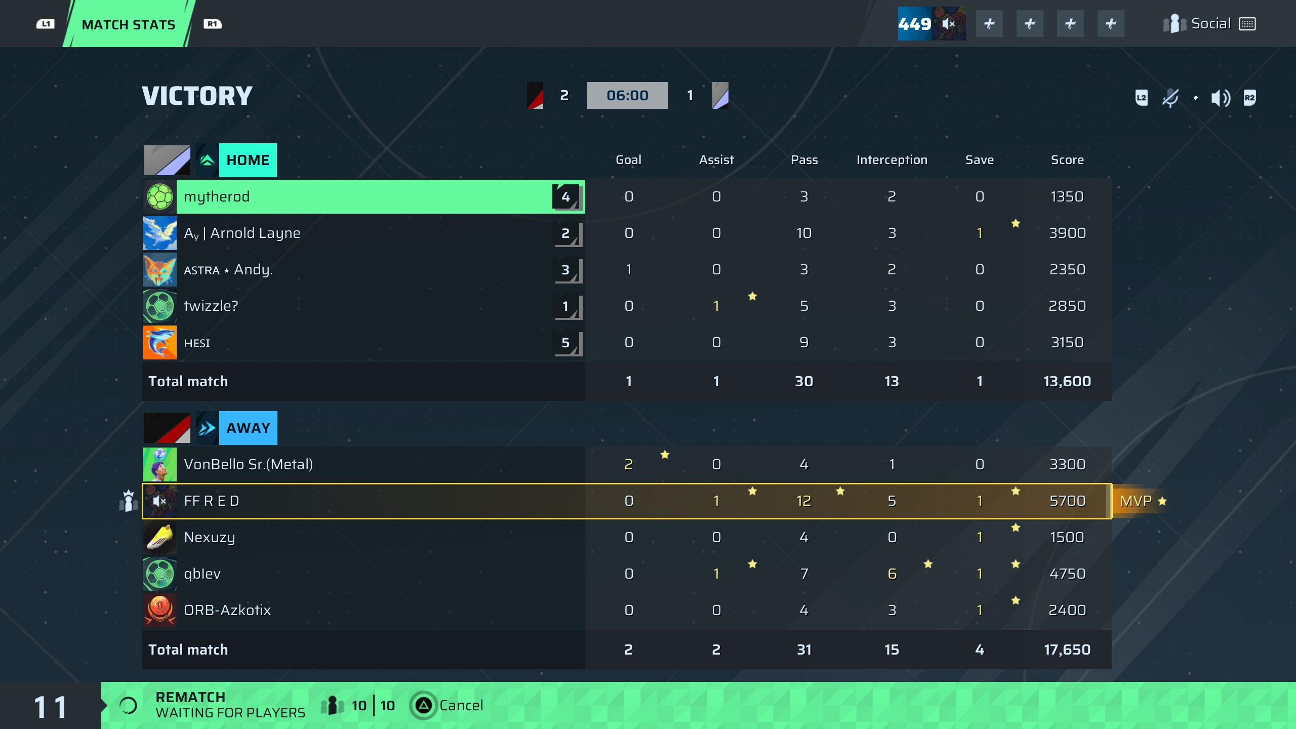 | Player | Goals | Assists | Passes | Interceptions | Saves | Score | Clean Sheet |