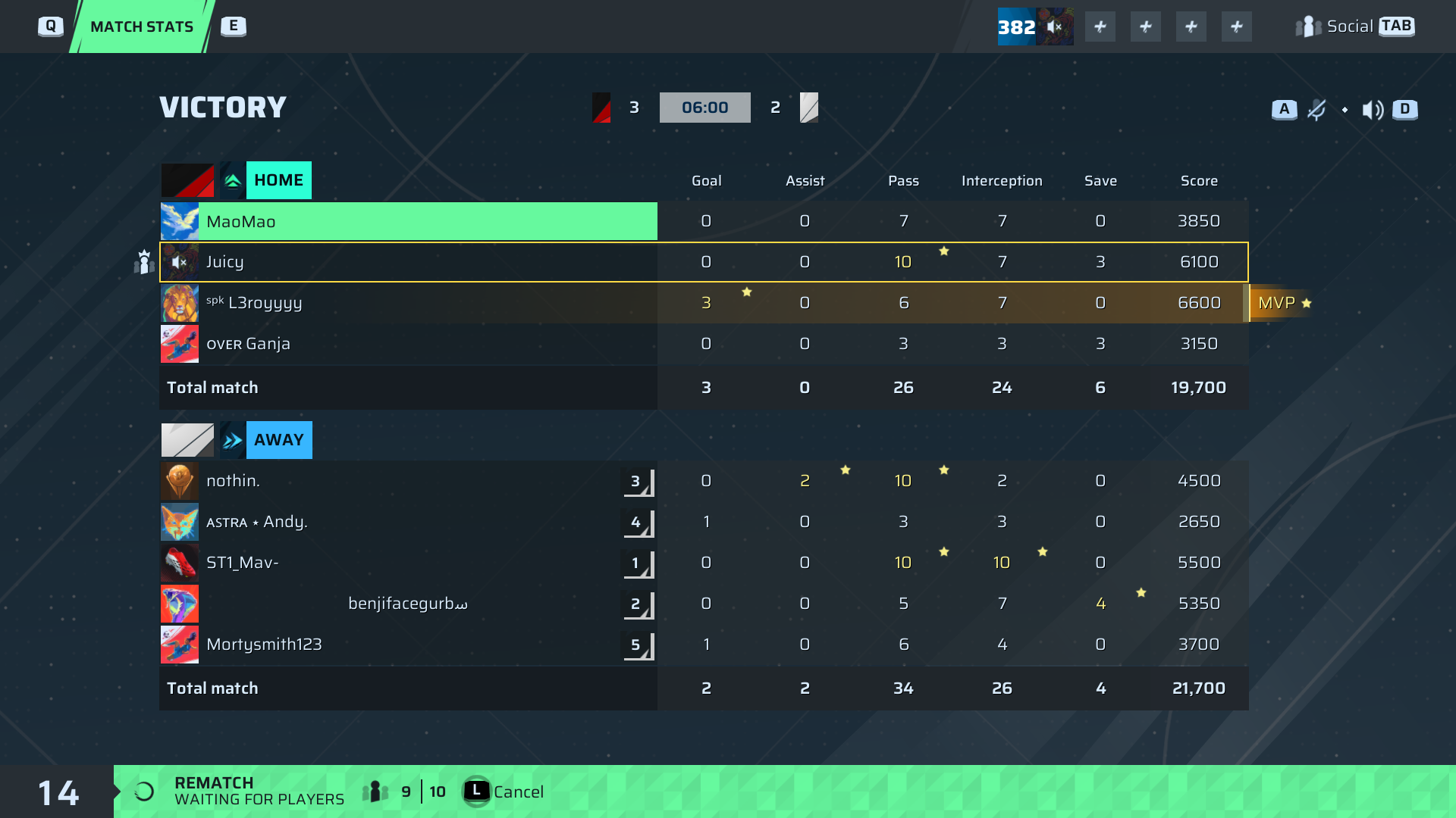 ˢᵖᵏ L3royyyy🐐#135 Striker⭐ MVP | 3 | 0 | 6 | 7 | 0 | 6,600 | — |