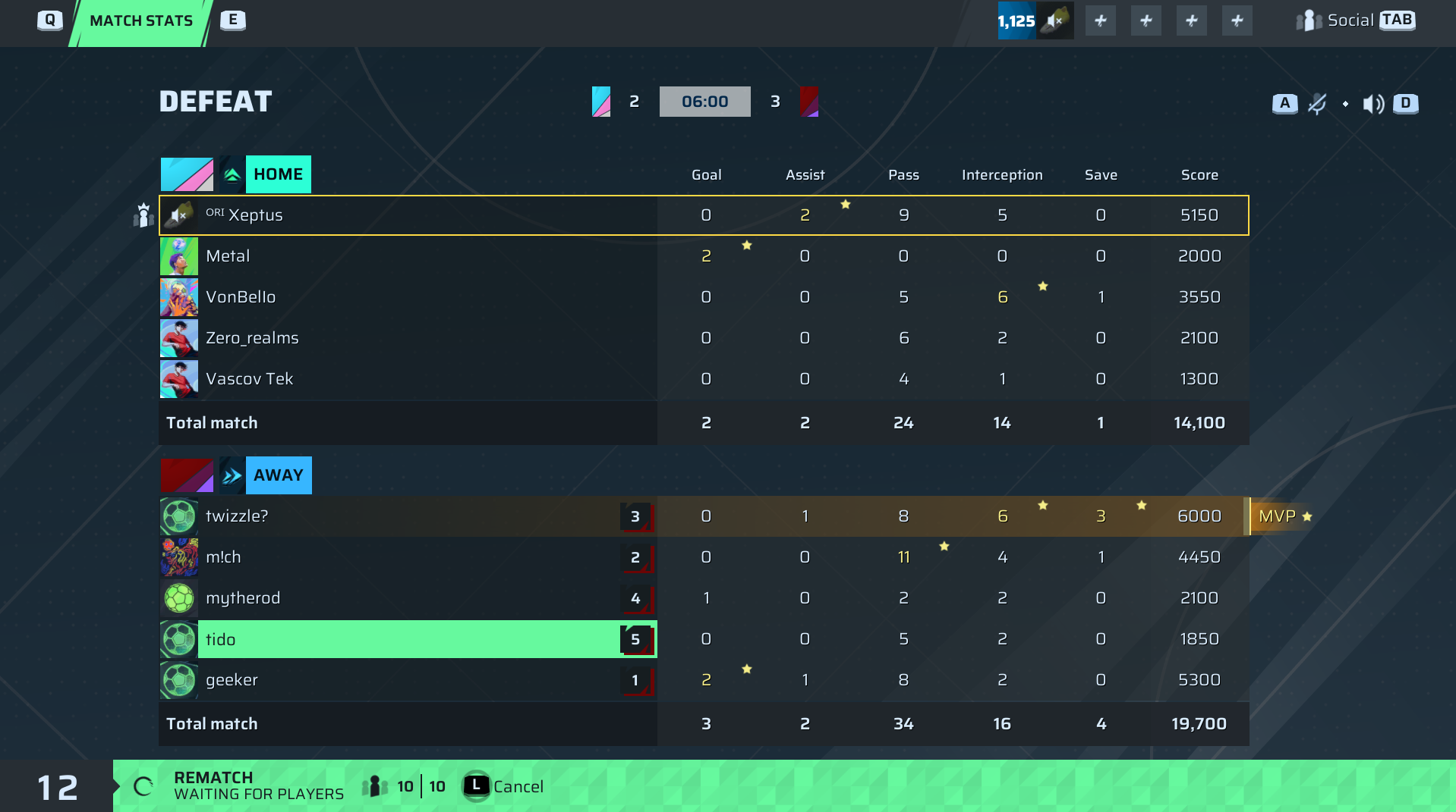 VonBello🐐#62 Goalkeeper | 0 | 0 | 5 | 6 | 1 | 3,550 | ✗ No |
