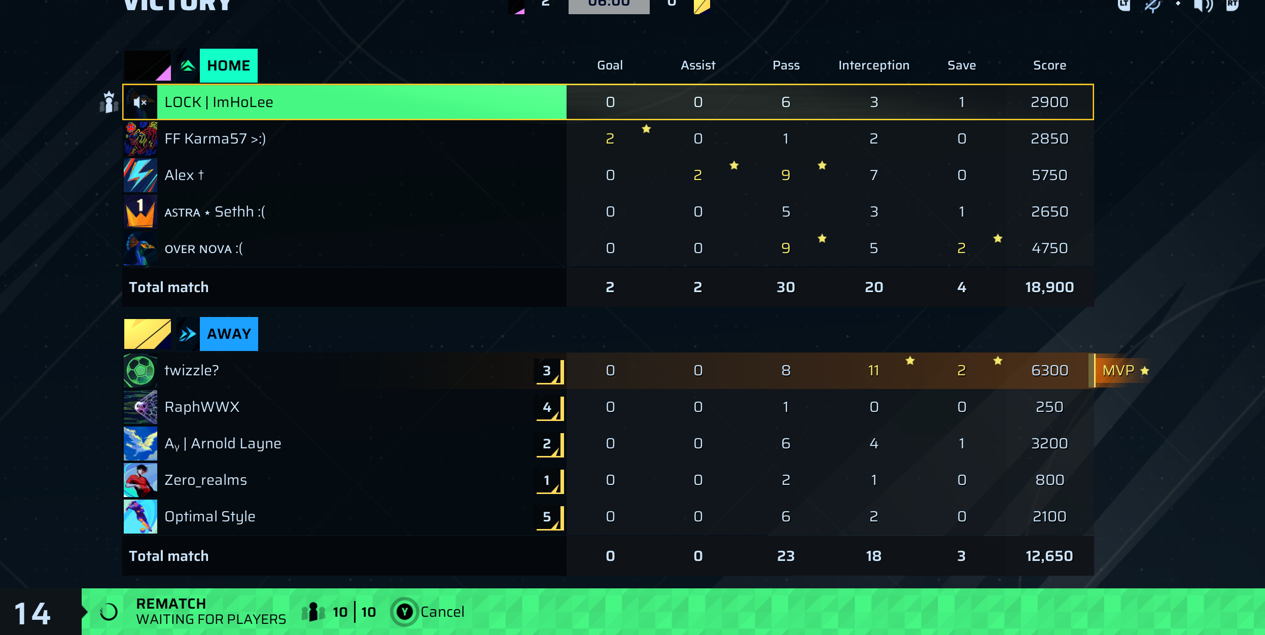 Alex † CAM⭐ MVP | 0 | 2 | 9 | 7 | 0 | 5,750 | — |