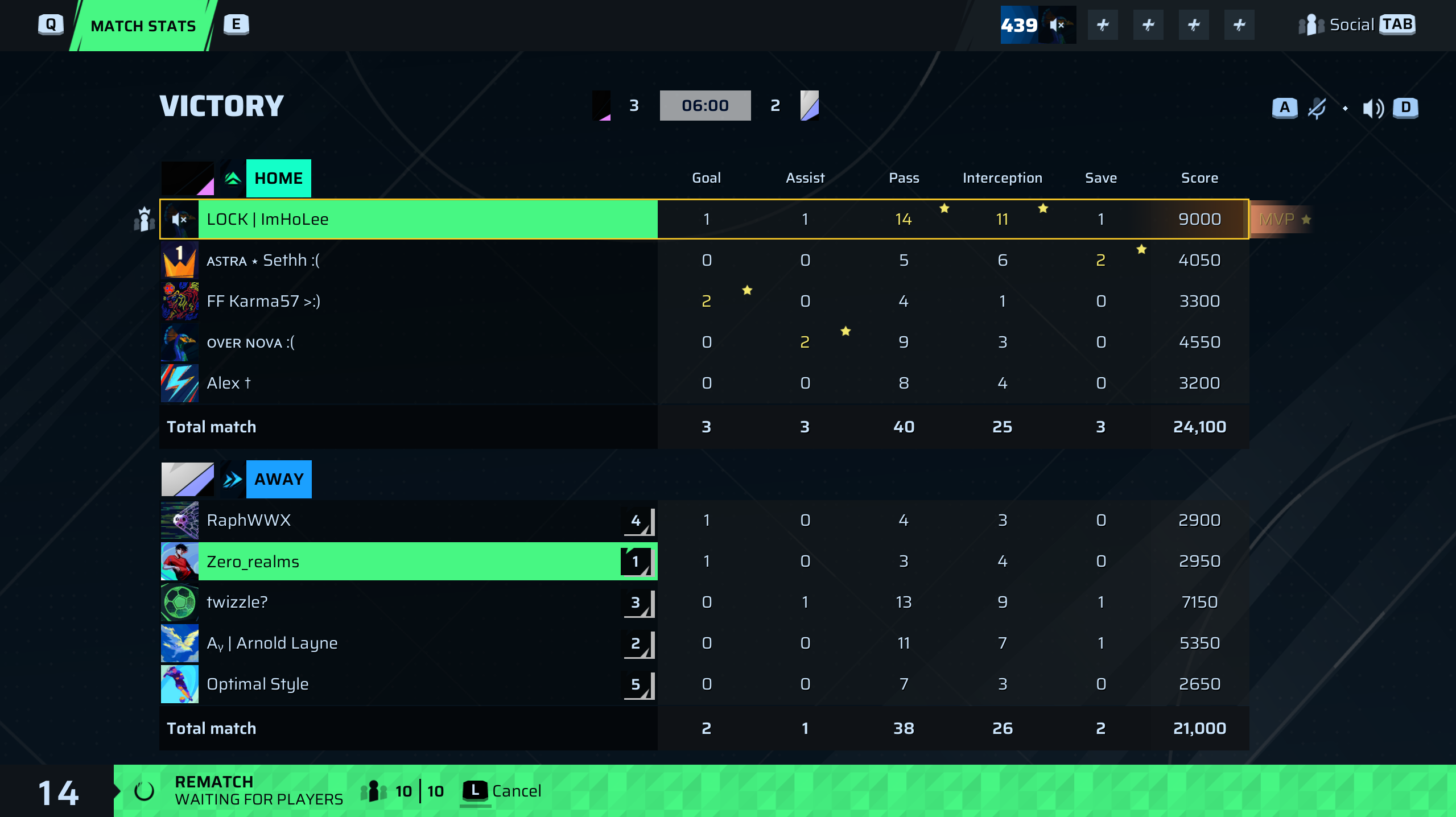 | Player | Goals | Assists | Passes | Interceptions | Saves | Score | Clean Sheet |