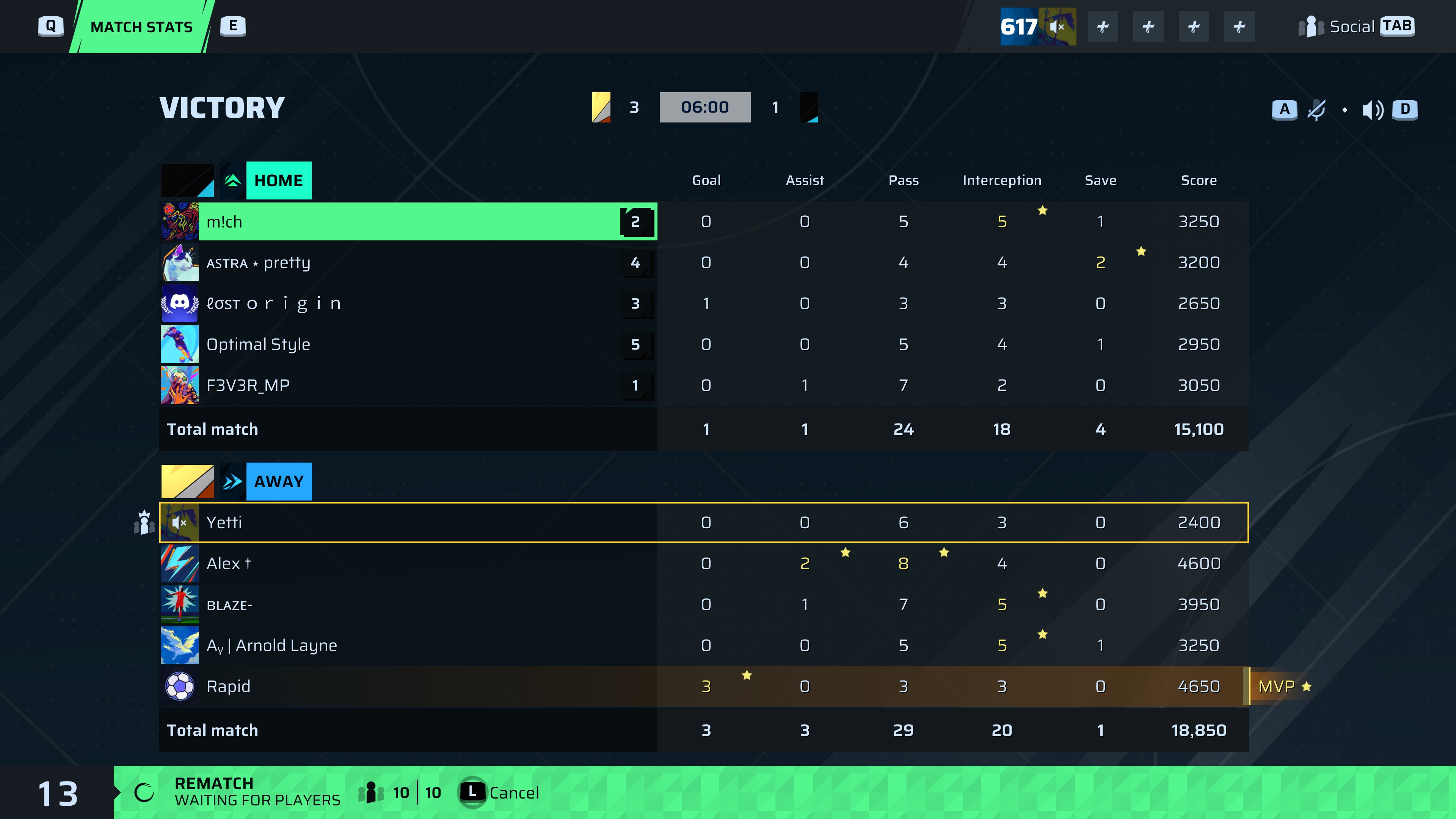 Rapid🐐#83 Striker⭐ MVP | 3 | 0 | 3 | 3 | 0 | 4,650 | — |