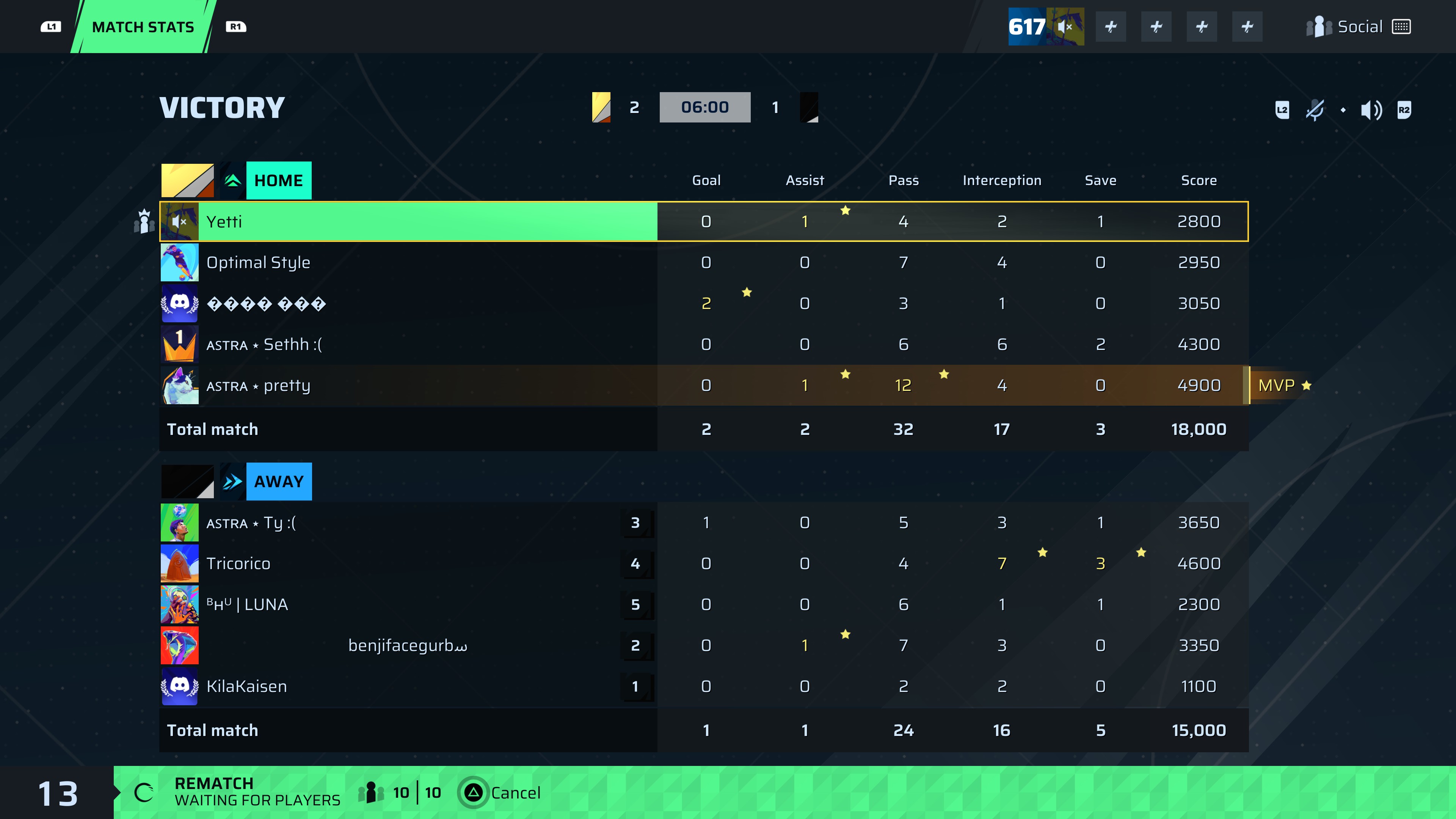 | Player | Goals | Assists | Passes | Interceptions | Saves | Score | Clean Sheet |