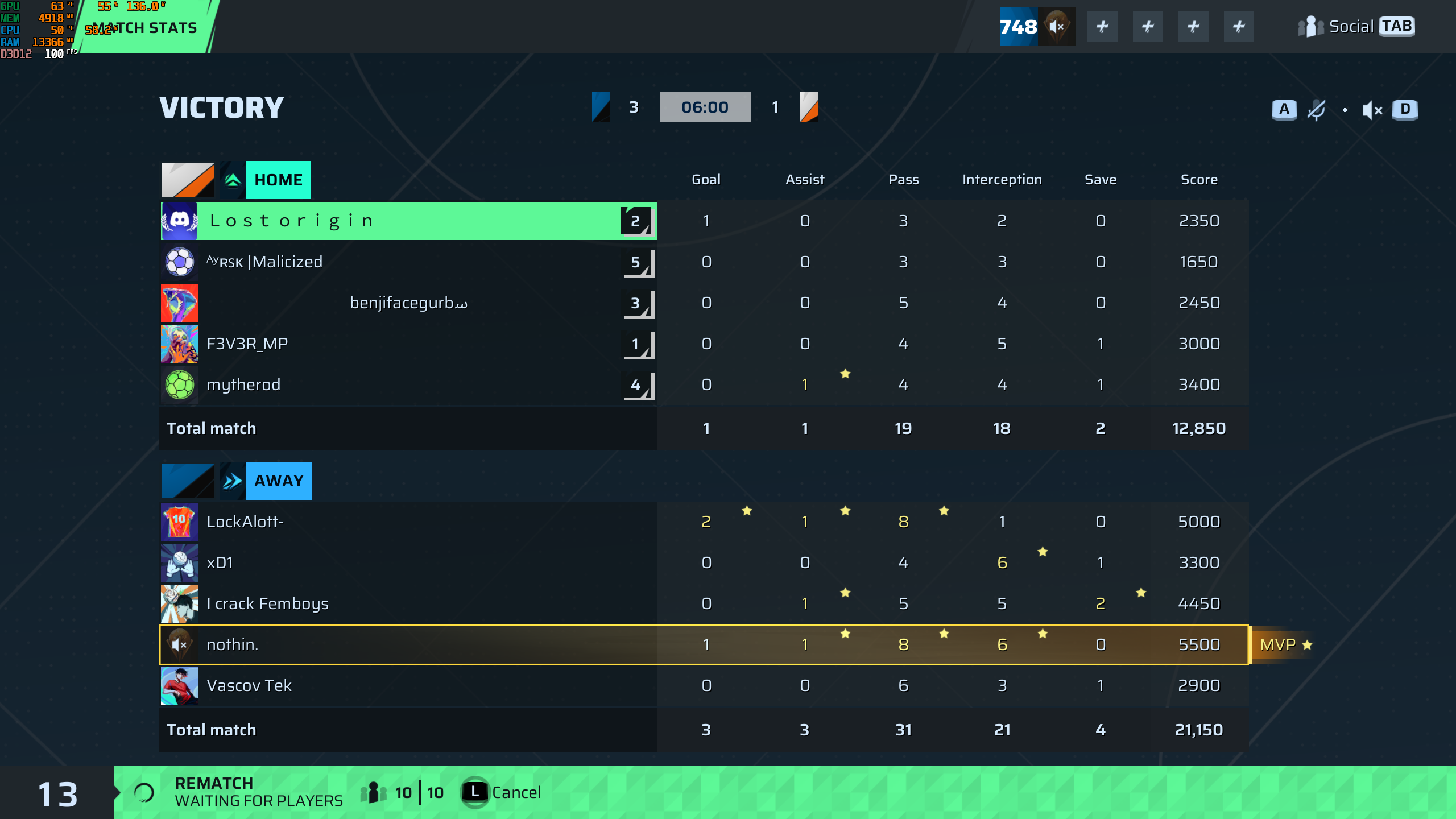 nothin. Striker⭐ MVP | 1 | 1 | 8 | 6 | 0 | 5,500 | — |