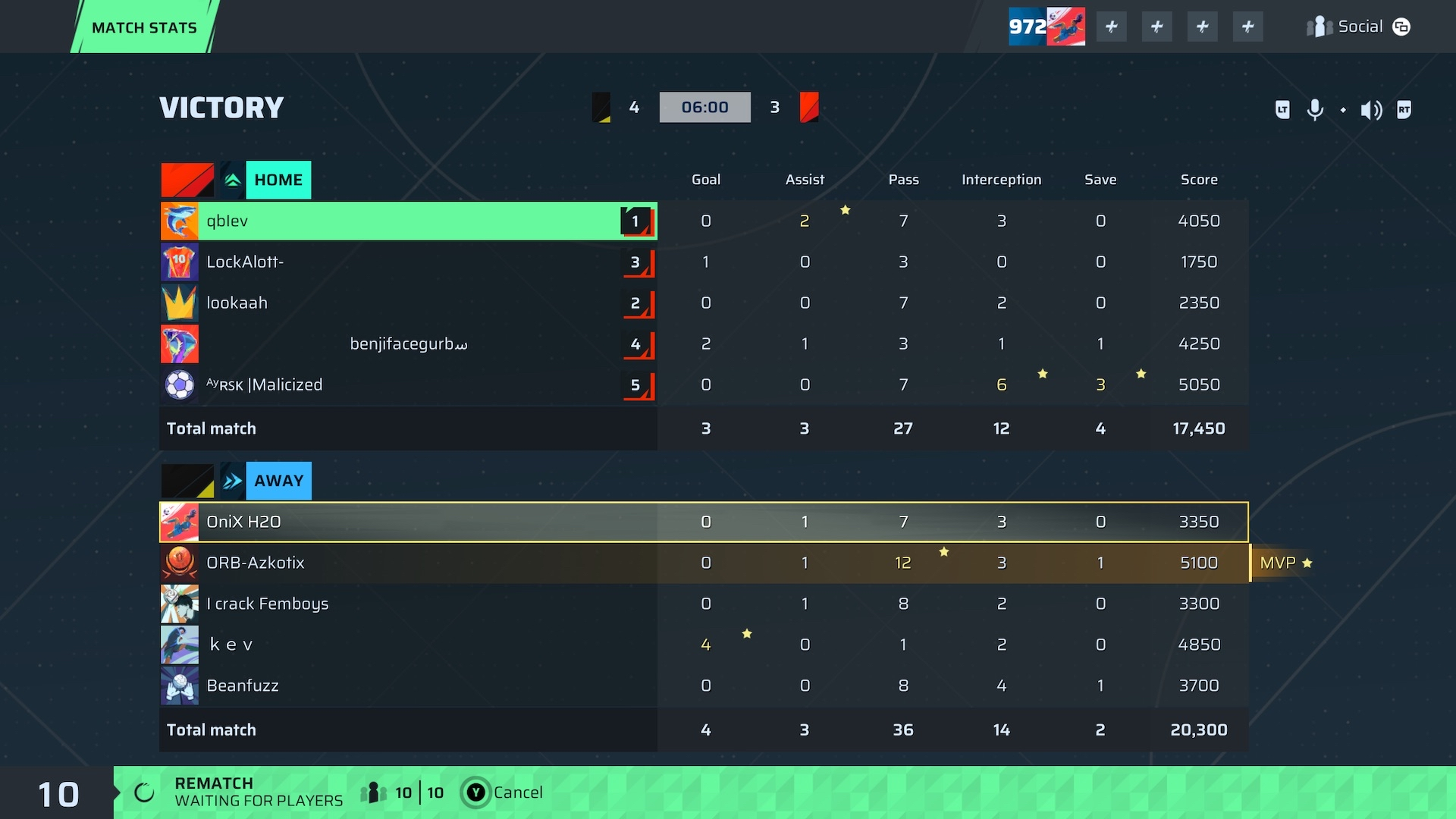 | Player | Goals | Assists | Passes | Interceptions | Saves | Score | Clean Sheet |