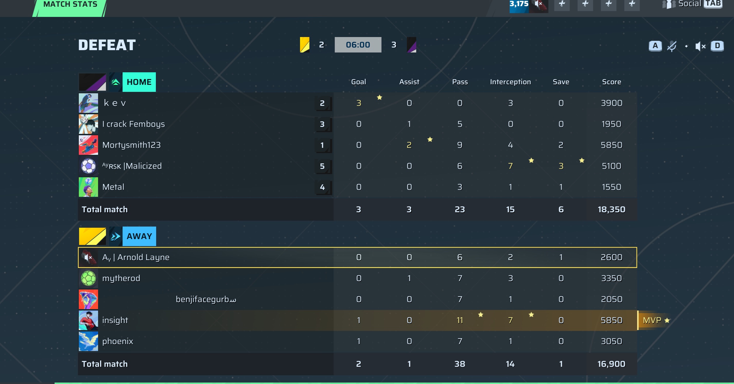 Aᵧ | Arnold Layne🐐#218 Goalkeeper | 0 | 0 | 6 | 2 | 1 | 2,600 | ✗ No |