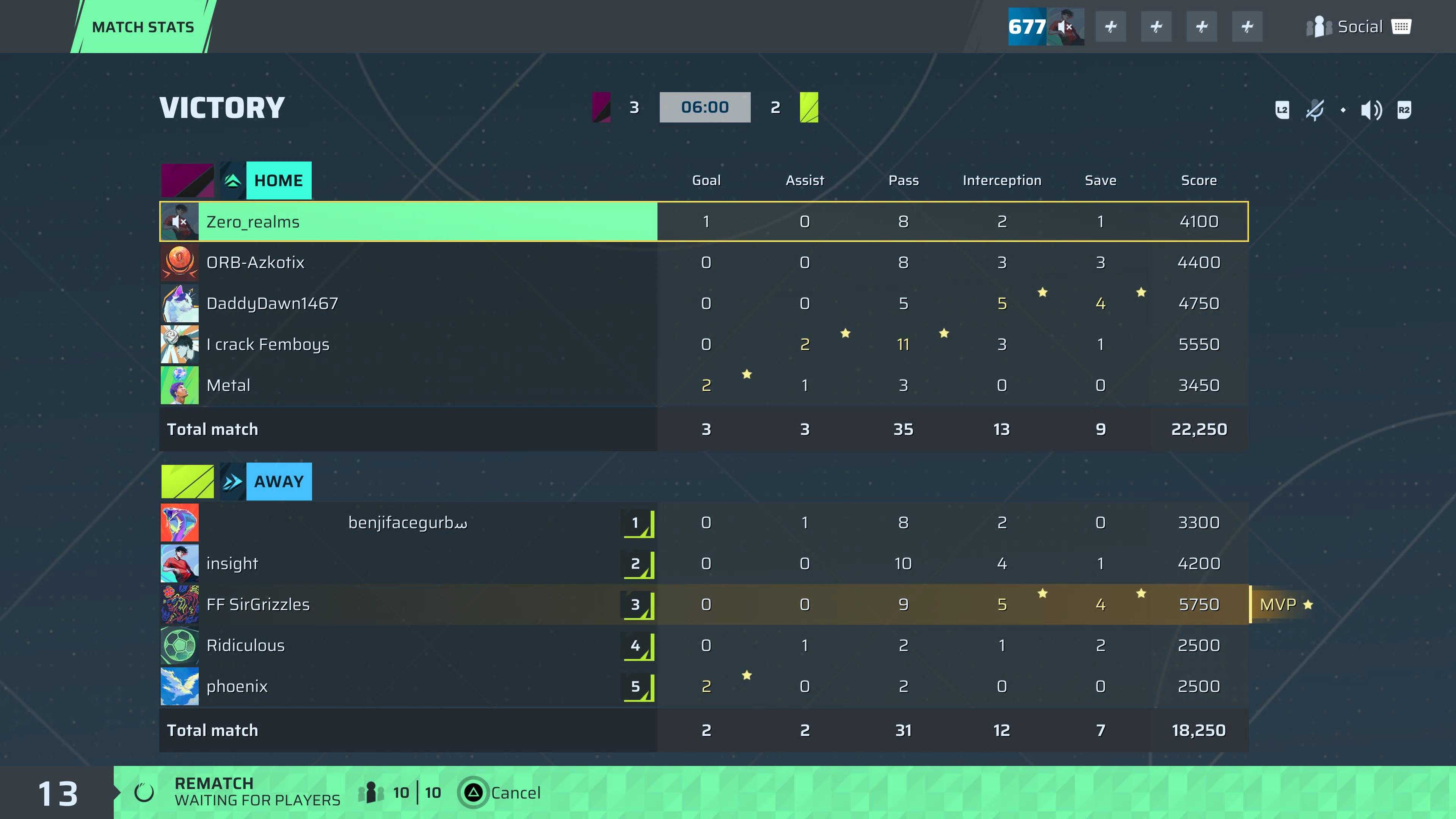 SirGrizzles🐐#21 Goalkeeper | 0 | 0 | 9 | 5 | 4 | 5,750 | ✗ No |