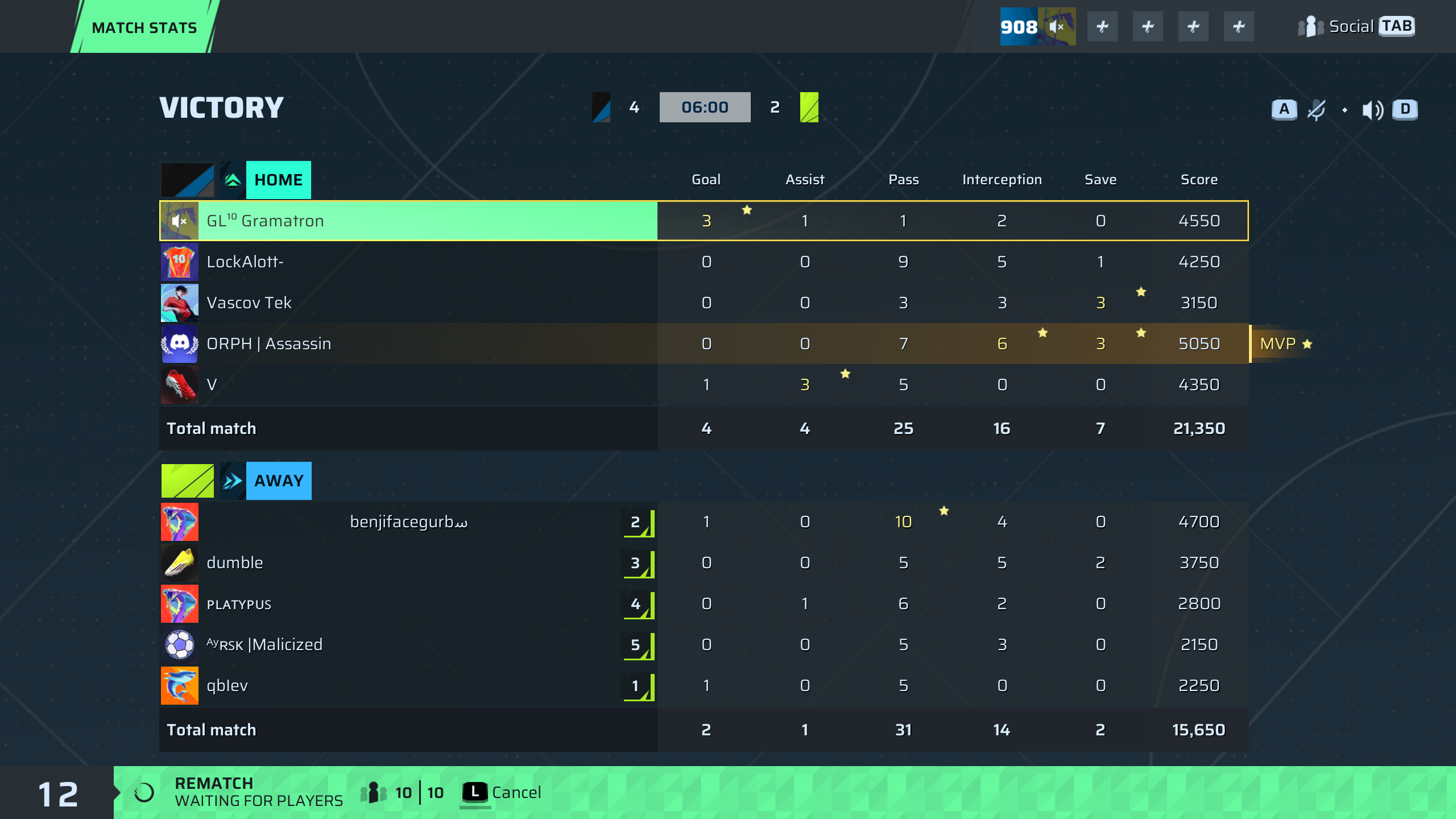 | Player | Goals | Assists | Passes | Interceptions | Saves | Score | Clean Sheet |
