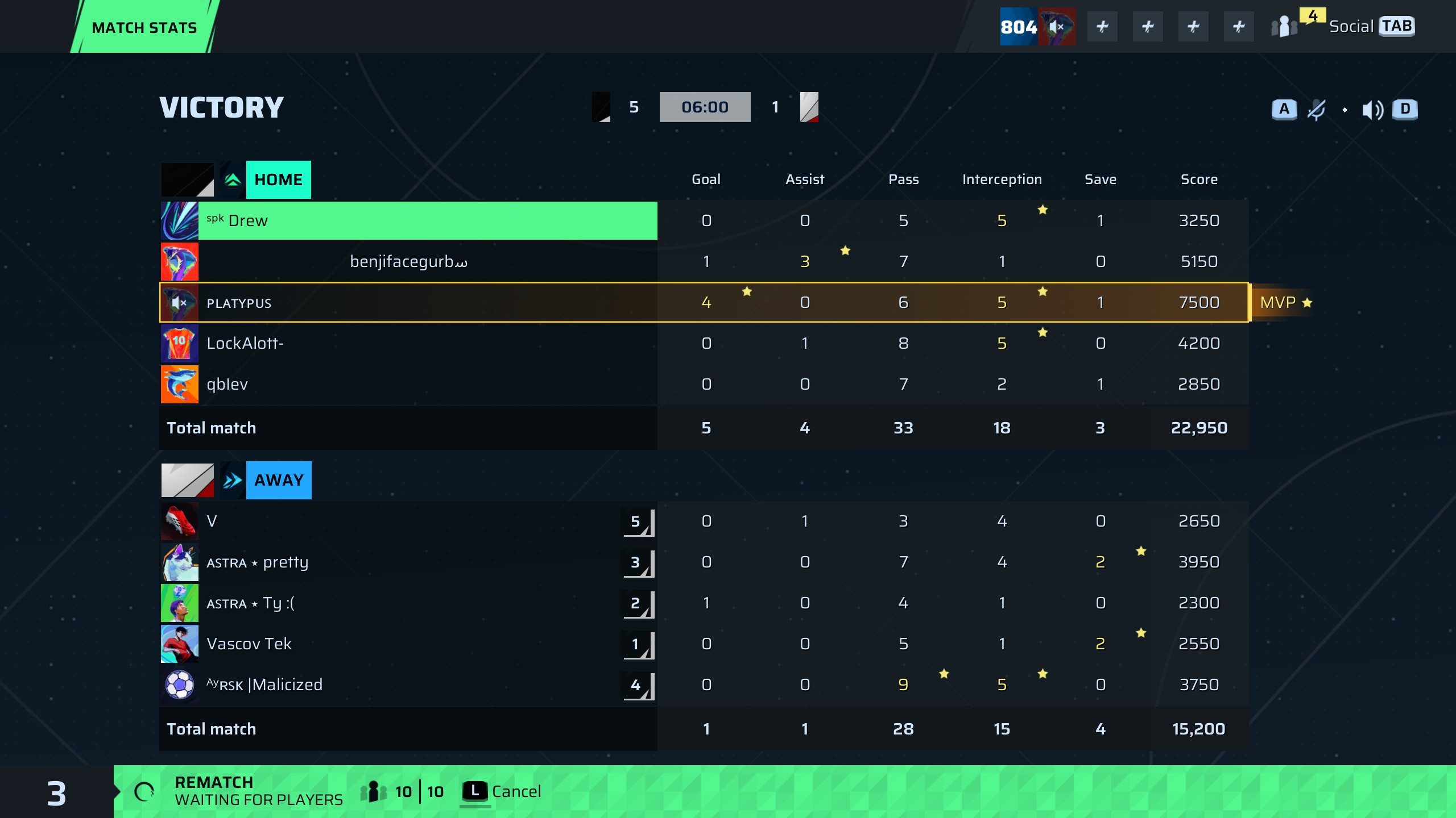 Platypus🐐#246 Striker⭐ MVP | 4 | 0 | 6 | 5 | 1 | 7,500 | — |