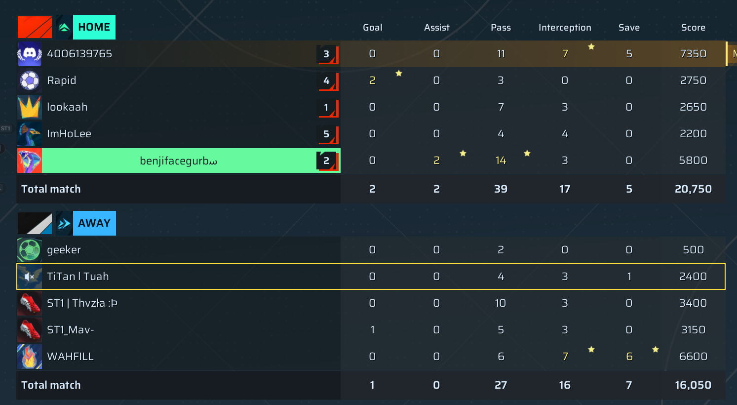 ST1_Mav-🐐#96 Goalkeeper | 1 | 0 | 5 | 3 | 0 | 3,150 | ✗ No |