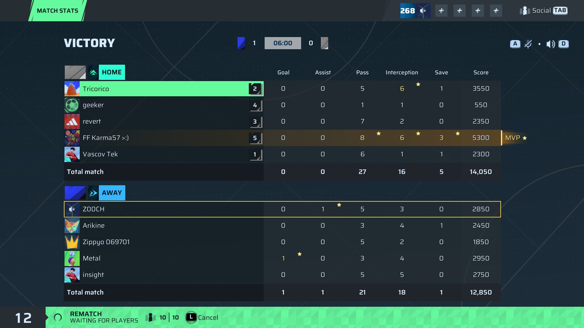 Tricorico🐐#105 Goalkeeper | 0 | 0 | 5 | 6 | 1 | 3,550 | ✗ No |