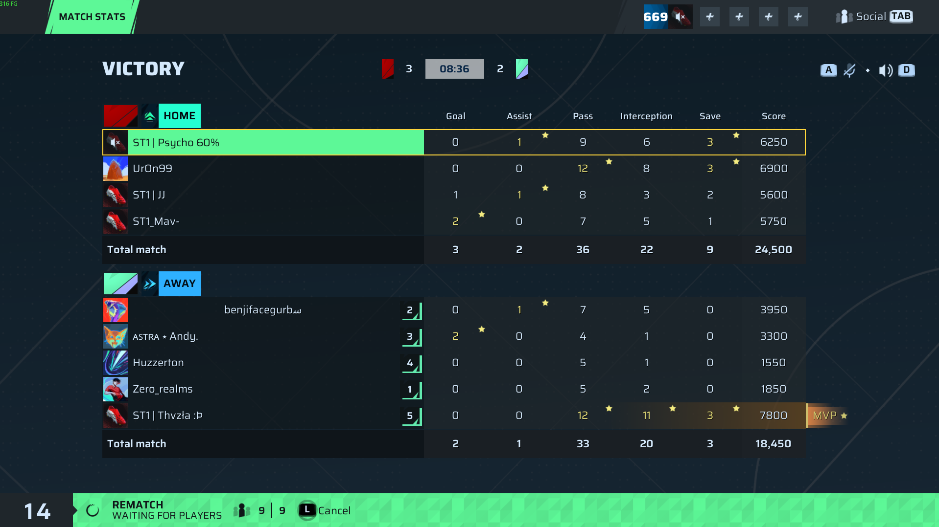 | Player | Goals | Assists | Passes | Interceptions | Saves | Score | Clean Sheet |