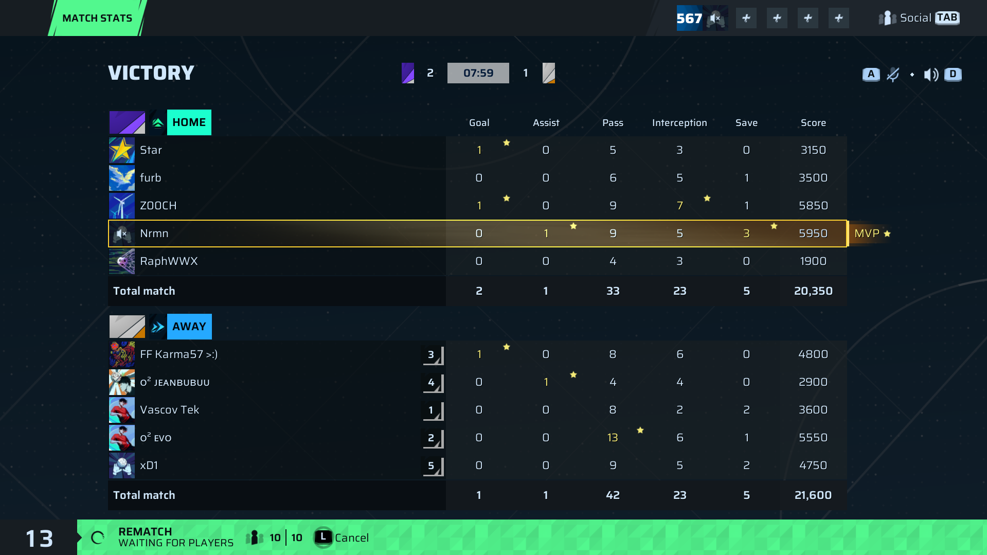 Nrmn🐐#123 Goalkeeper⭐ MVP | 0 | 1 | 9 | 5 | 3 | 5,950 | ✗ No |